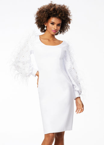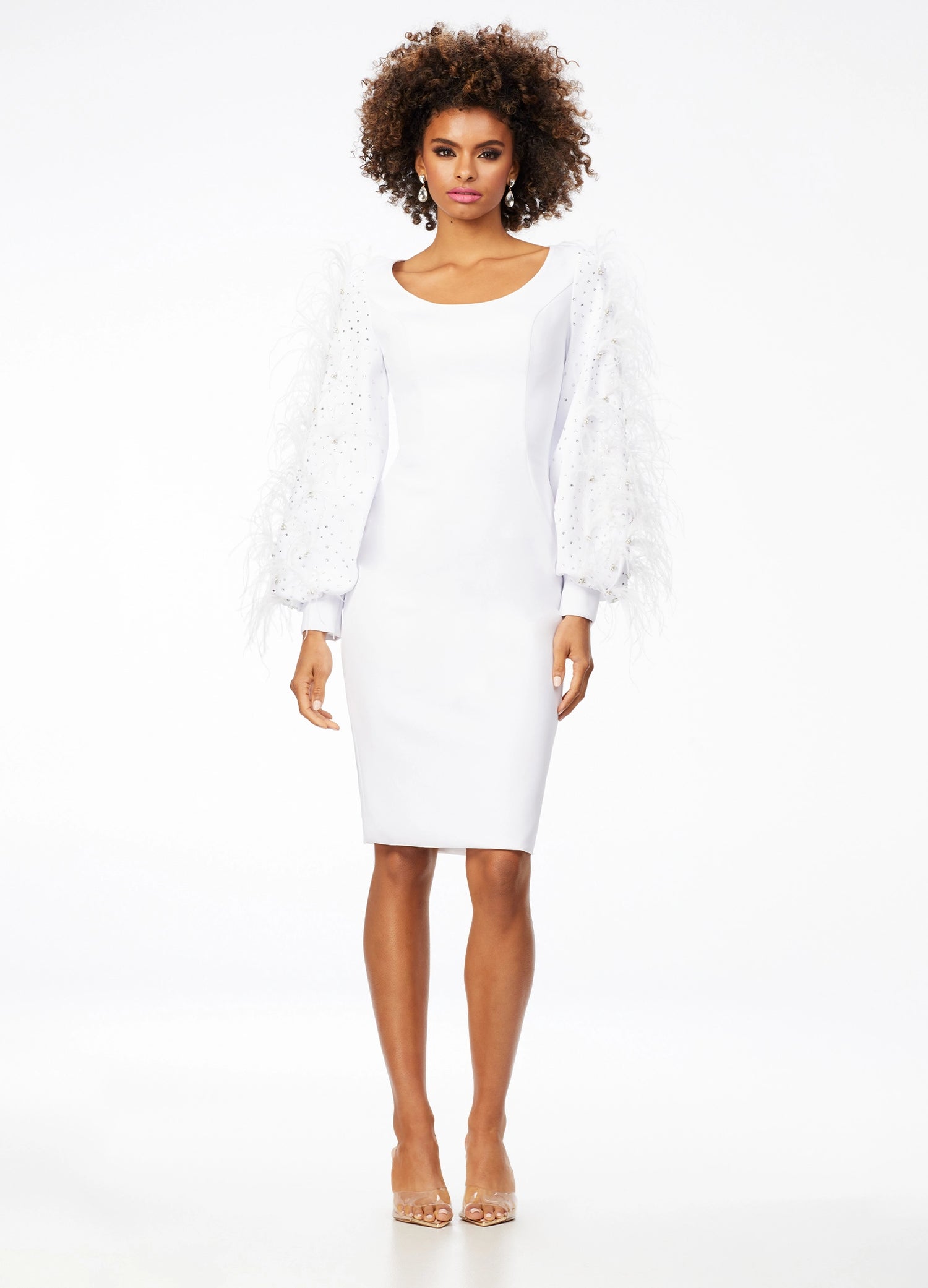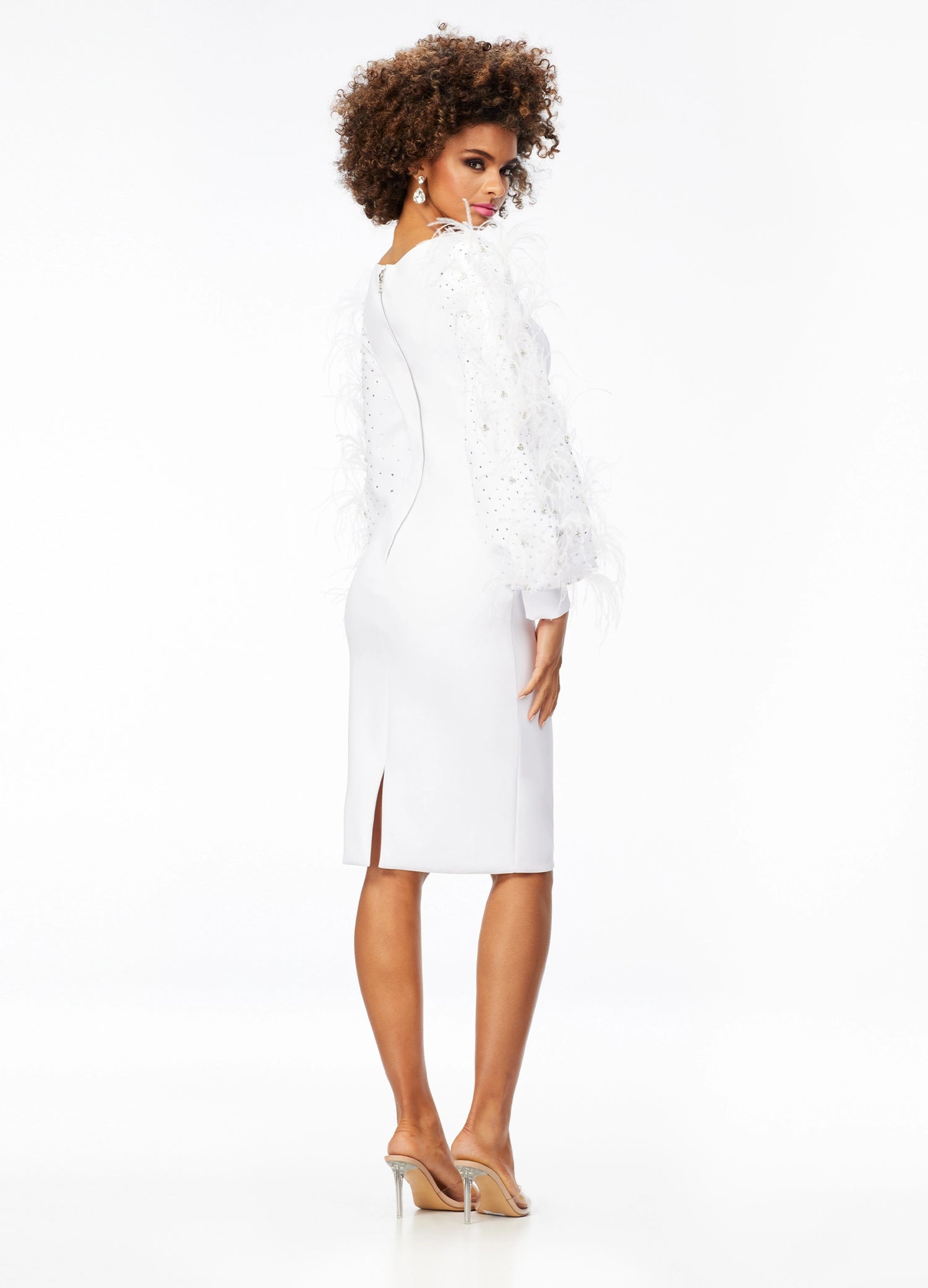 This elegant scuba cocktail dress features a scoop neckline and bishop sleeves. The bishop sleeves are embellished with scattered crystals and feathers. The look is complete with a tea-length fitted skirt and full zipper back