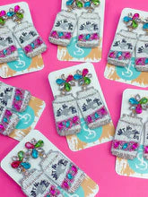 This pair of beaded earrings is to die for. Perfect for the summertime and great with jeans, it features a mix of colorful gems and beads with a hint of sparkle. These earrings are very light weight so you can wear them all day without any discomfort. Playful and fun, get them today!