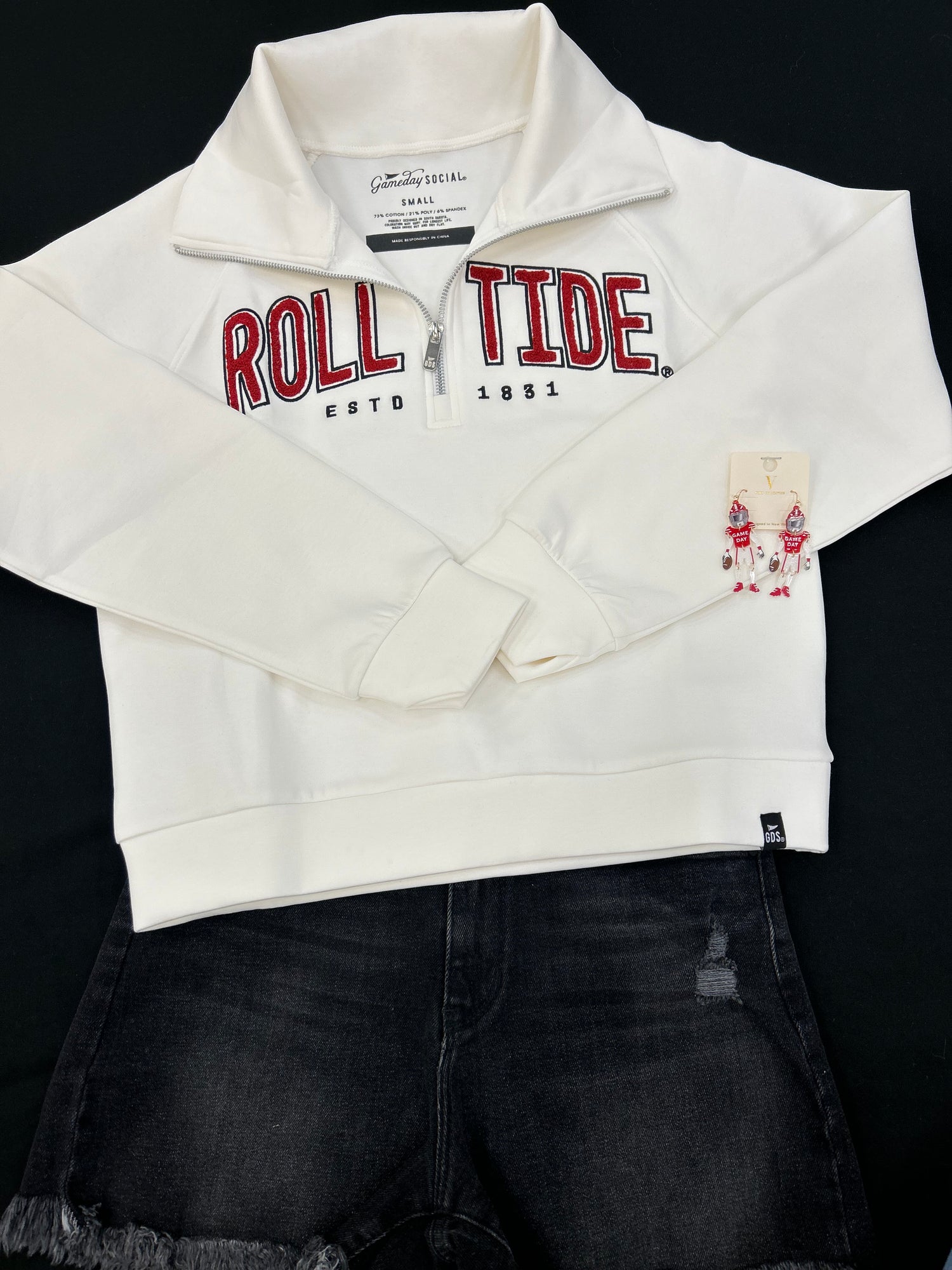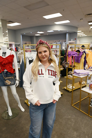 Introducing our Alabama Sears Split Quarter Zip, the ultimate game day essential. Made with luxurious, soft-touch fabric, this premium quality garment will elevate any outfit. Pair it with your favorite jeans for a stylish and comfortable look. Game day just got a whole lot better with this must-have piece!