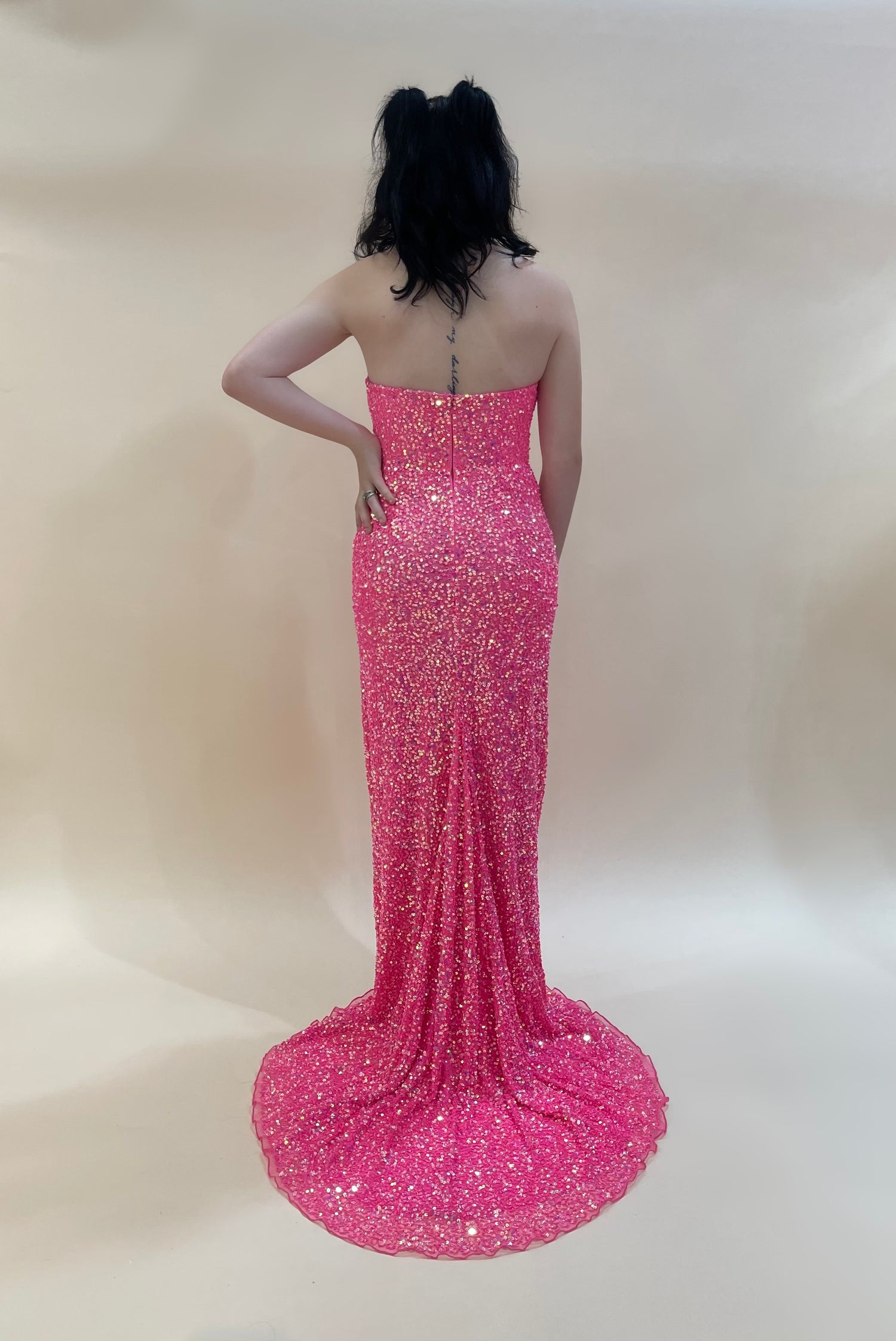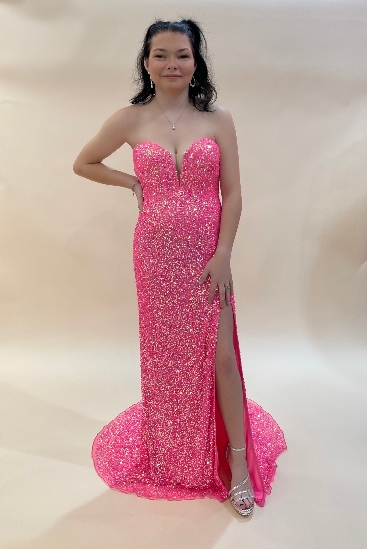 A simple, elegant strapless prom dress is classically elegant. This fitted, bateau-neck style with a deep V neckline is crafted of sequin fabric to ensure a sparkly evening look. A slit at the front of the bodice adds curve-flattering movement to every step.