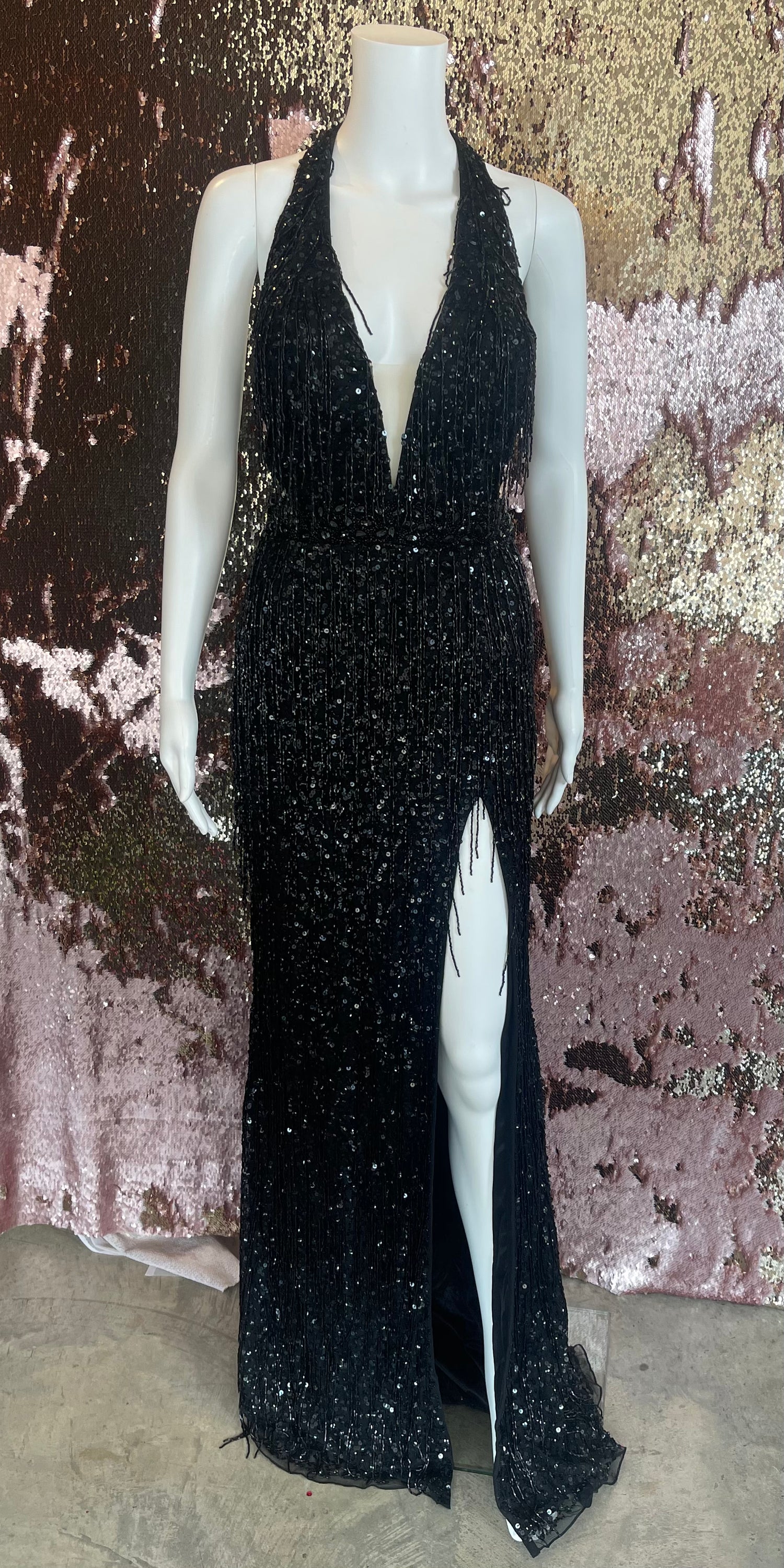 Dress to impress in this beautiful deep V-neck prom dress. The fitted silhouette and slit, beaded detail around the waist adds the perfect touch.