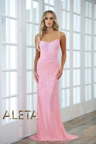 The intricate beadwork and patterns on this Aleta Spring straight neckline dress with spaghetti straps create a stunning visual effect that catches the light beautifully. The beadwork on the dress adds texture and dimension, making it a true work of art. The gown also has a chapel train that trails behind you as you walk, creating a graceful and regal effect.