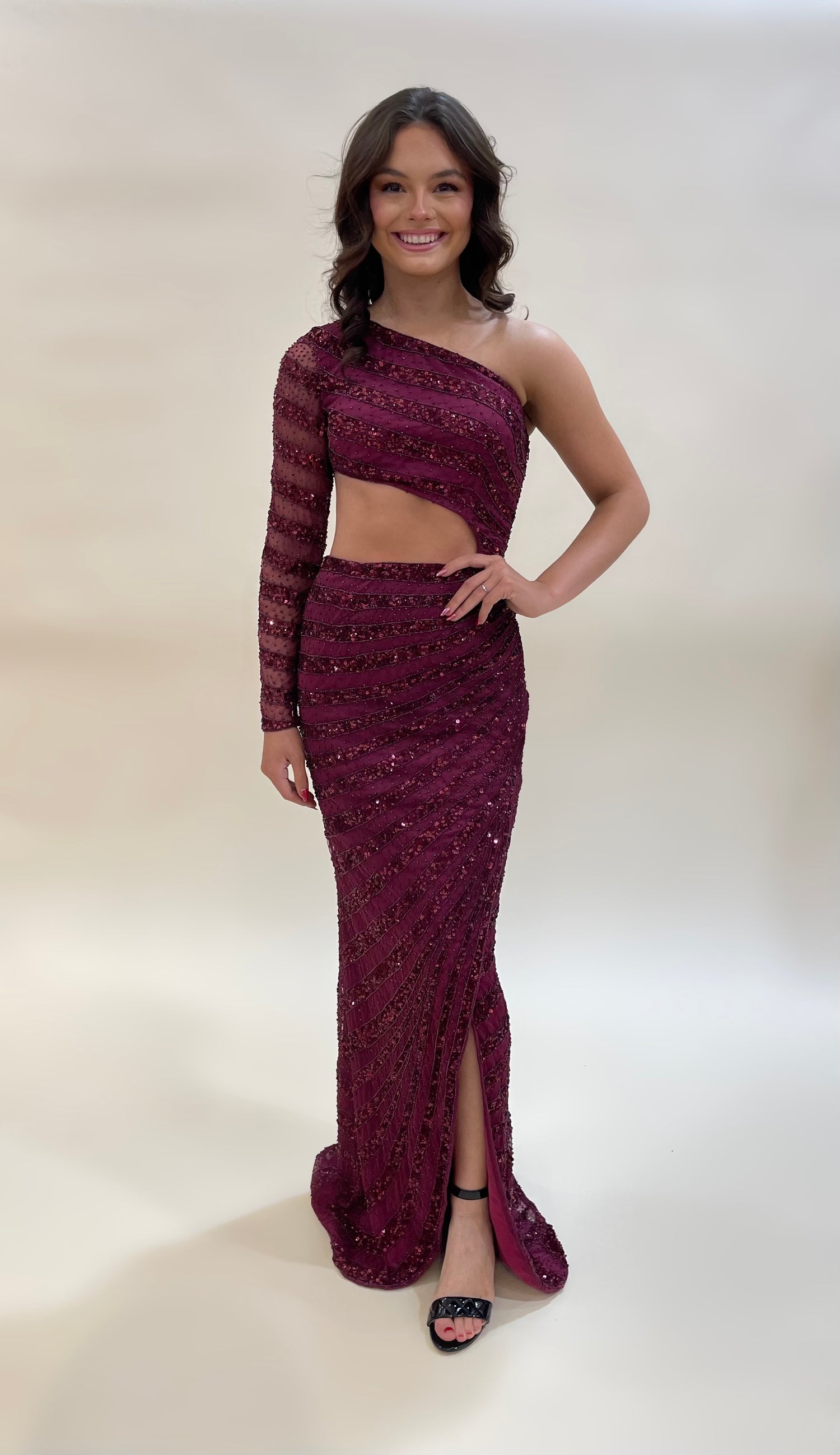 This elegant prom dress has a fitted bodice, elegant cut-out side, one sleeve, and slit. Show off your beautiful body with this unique prom dress.