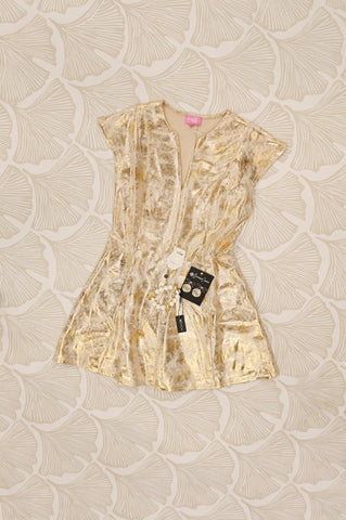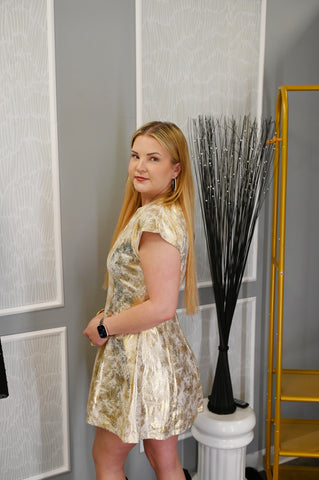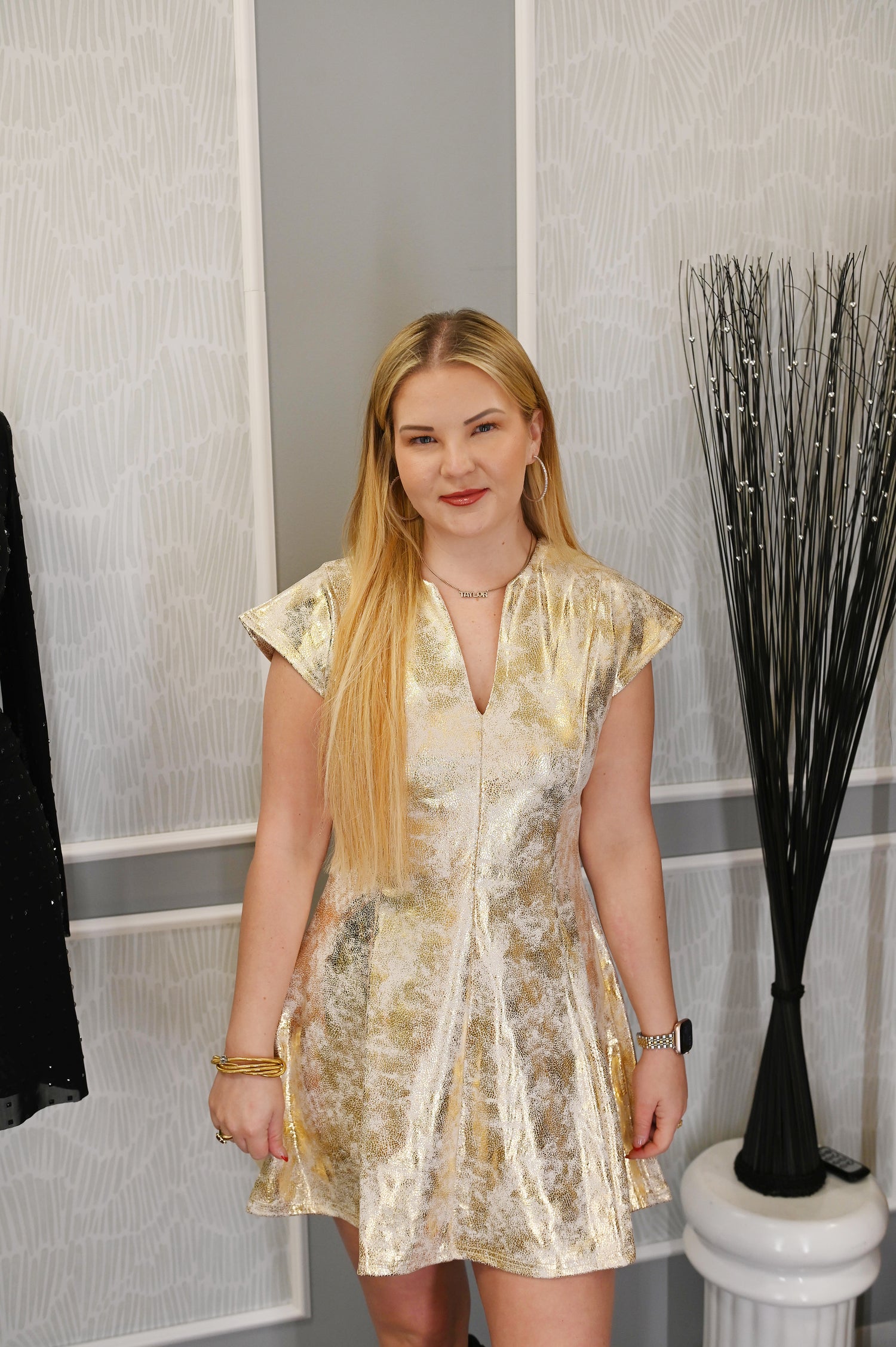 Shine bright in the Alice Dress from Sincerely Ours, a stunning metallic mini that’s equal parts bold and elegant. This golden beauty features a luxe shimmer finish with a subtle textured pattern that catches the light from every angle.