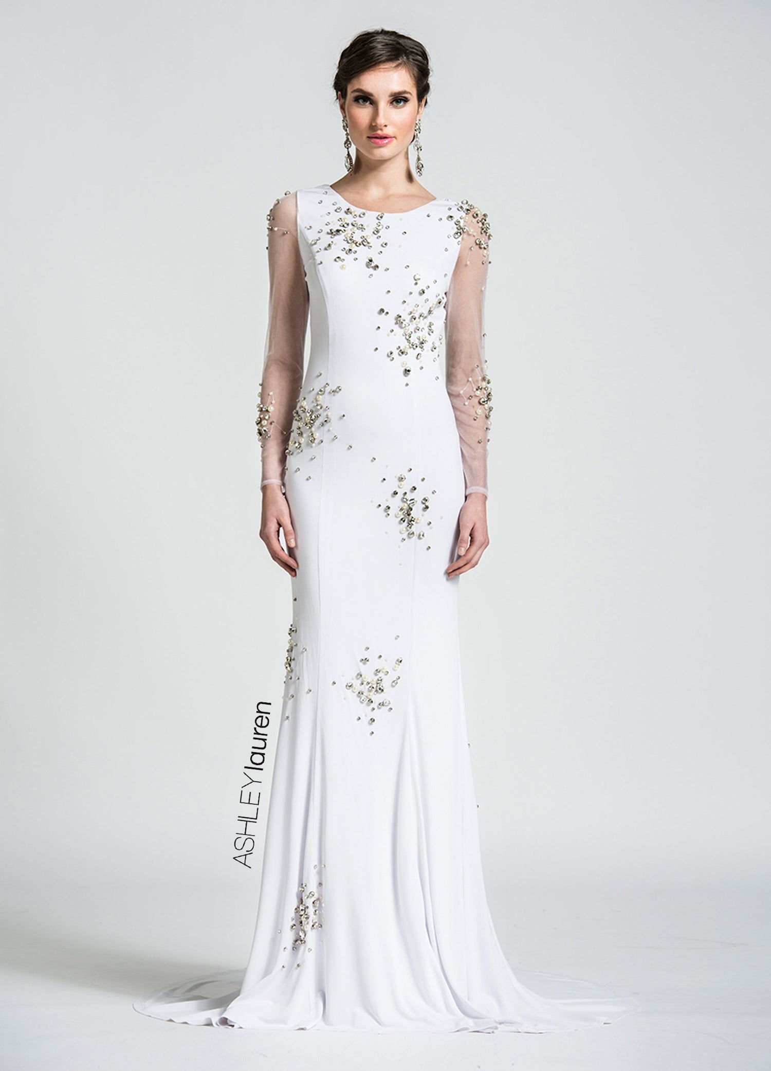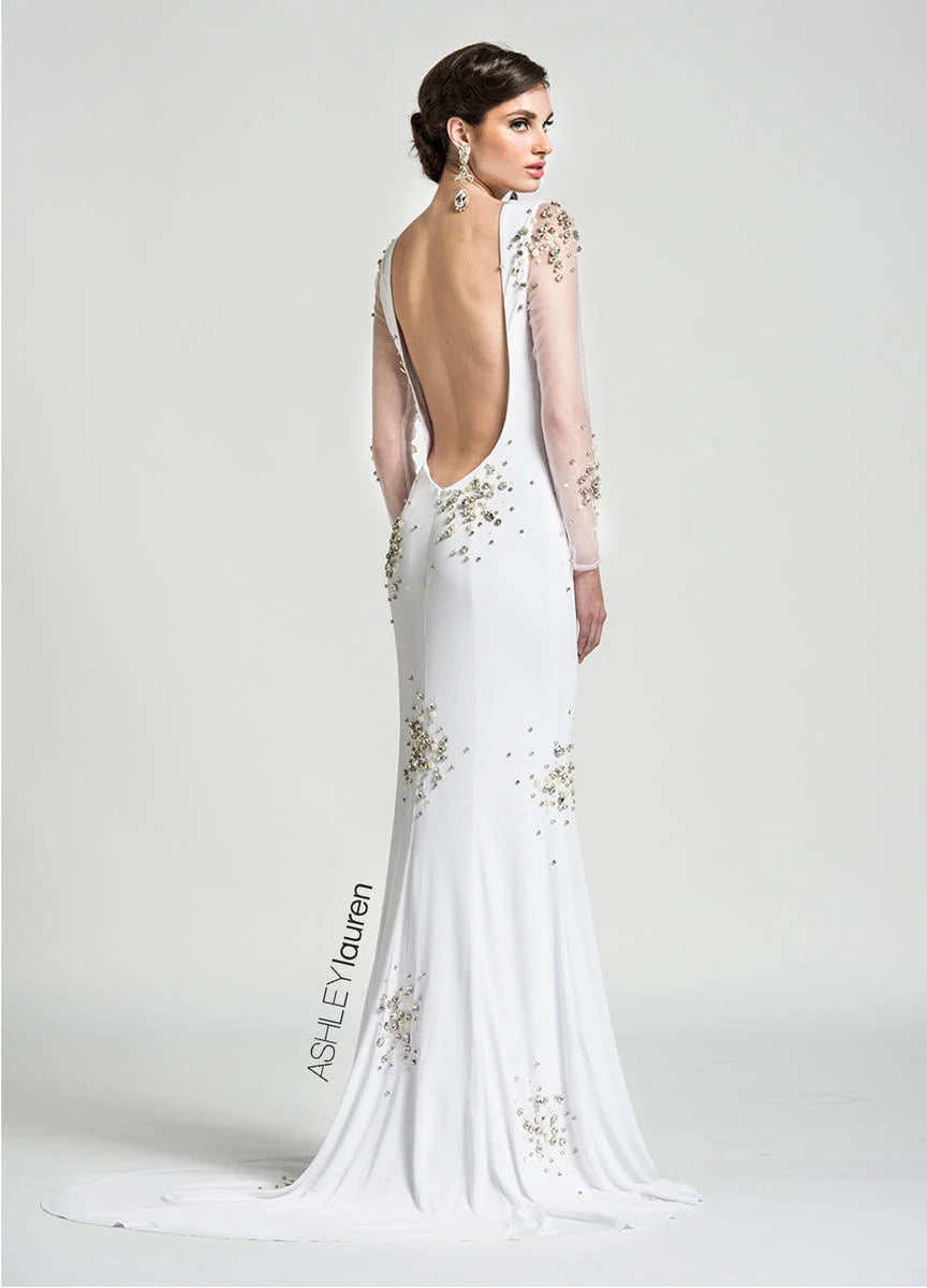 The ASHLEYlauren 1053 is an exquisite jersey evening dress featuring illusion sleeves and a deep-V back. Its elegant silhouette provides a timeless look and the jersey fabric is comfortable and breathable, making it a perfect choice for special occasions.
