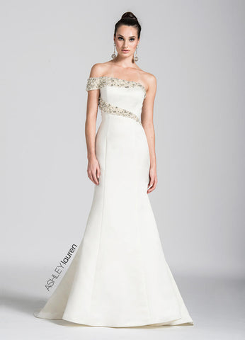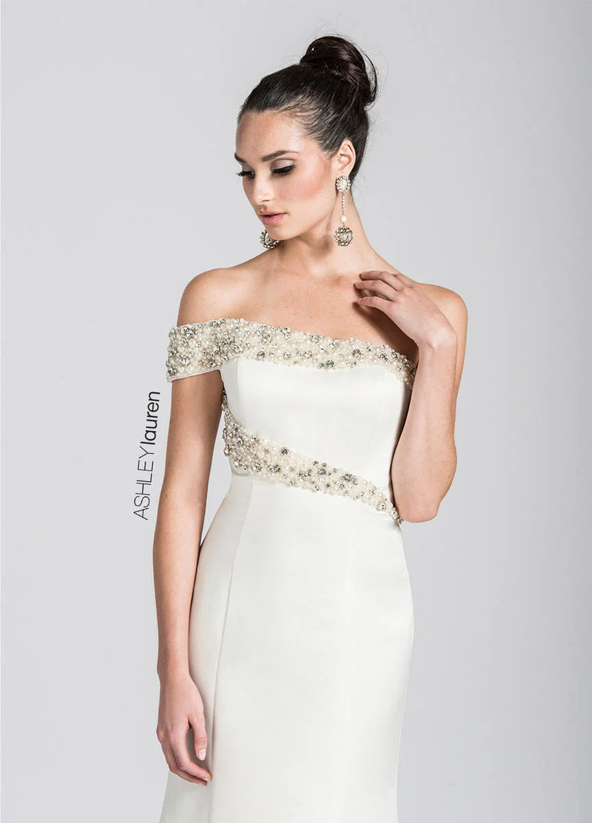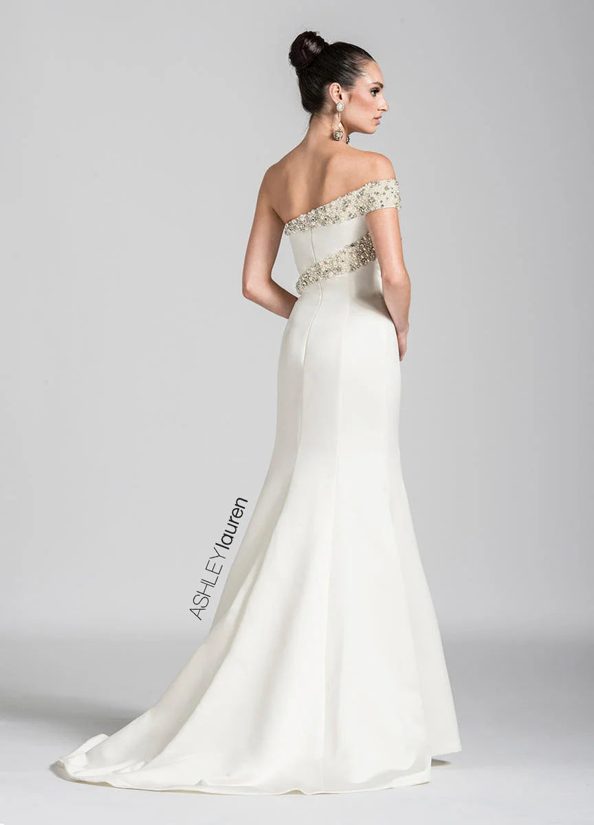 Walk the runway in this beaded evening dress. The asymmetrical rhinestone and pearl detail wrap around the arm and bodice hugging every curve. The satin flows down the body finishing with an eloquent train.