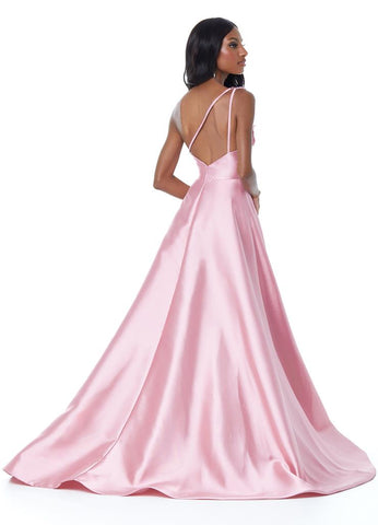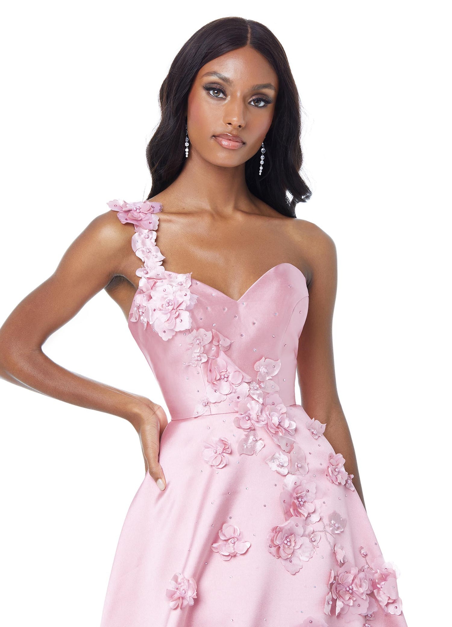This ASHLEYlauren 11002 dress features a one shoulder silhouette with pockets, hand-crafted floral appliqué, and intricate floral detailing to add a unique touch. This elegant piece is sure to make a statement wherever it goes!