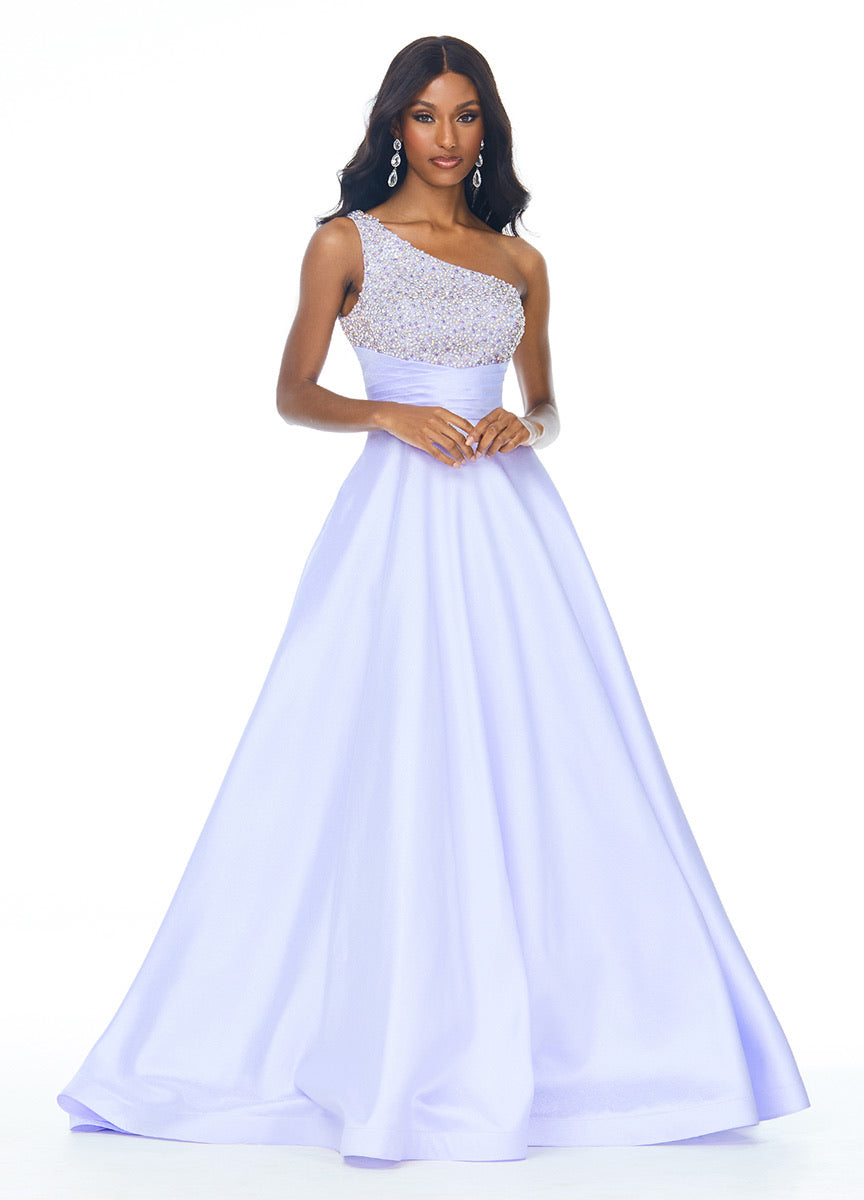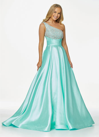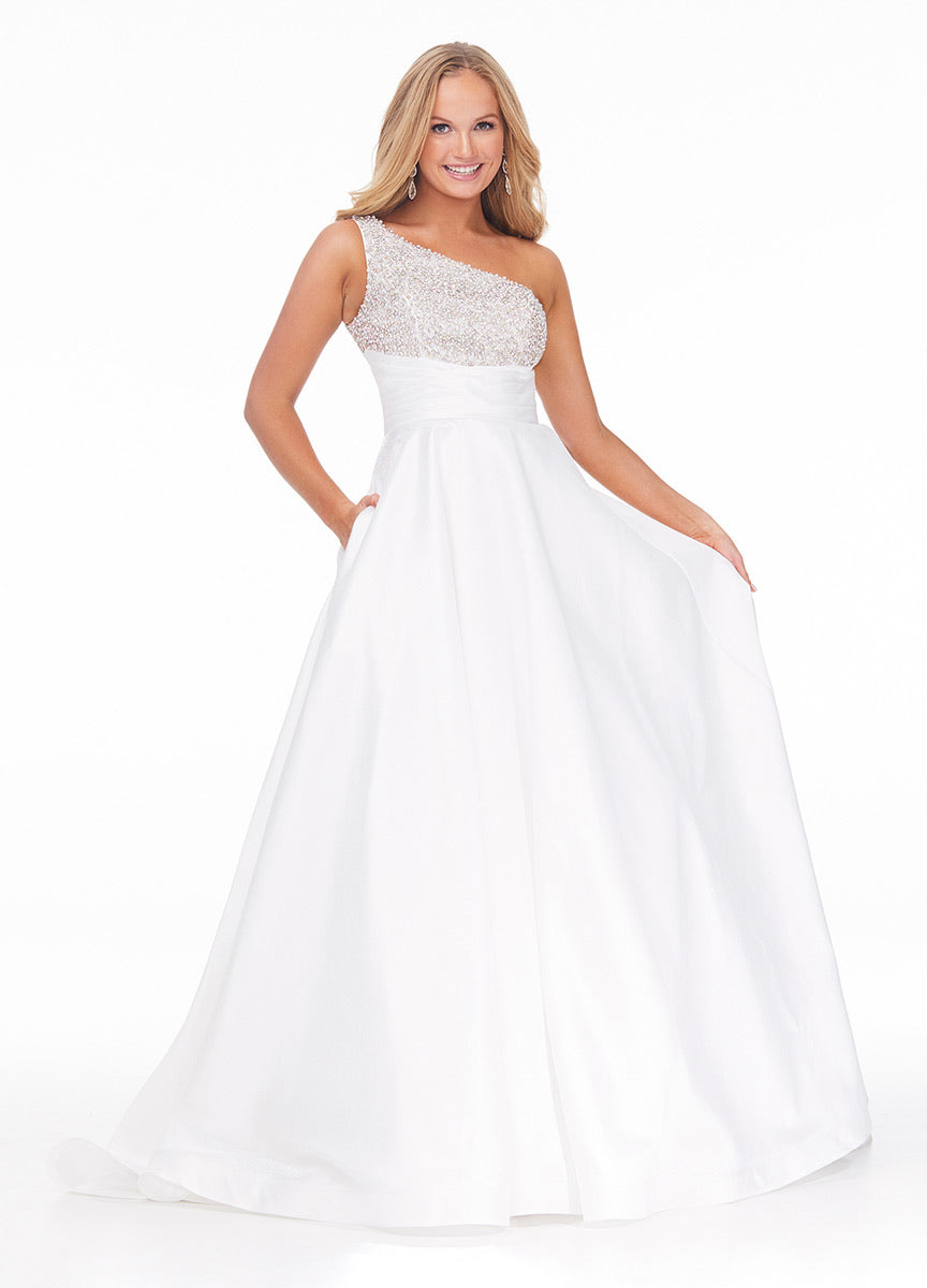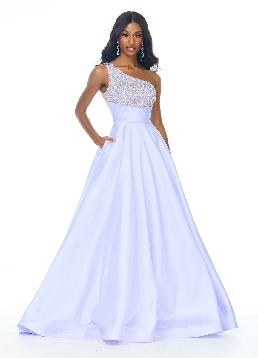 Be the star of the show in this one-shoulder ball gown with a beaded bustier. The bustier is encrusted with pearls and crystals that give way to a pleated belt sure to accentuate your figure. The ball gown skirt is complete with pockets.