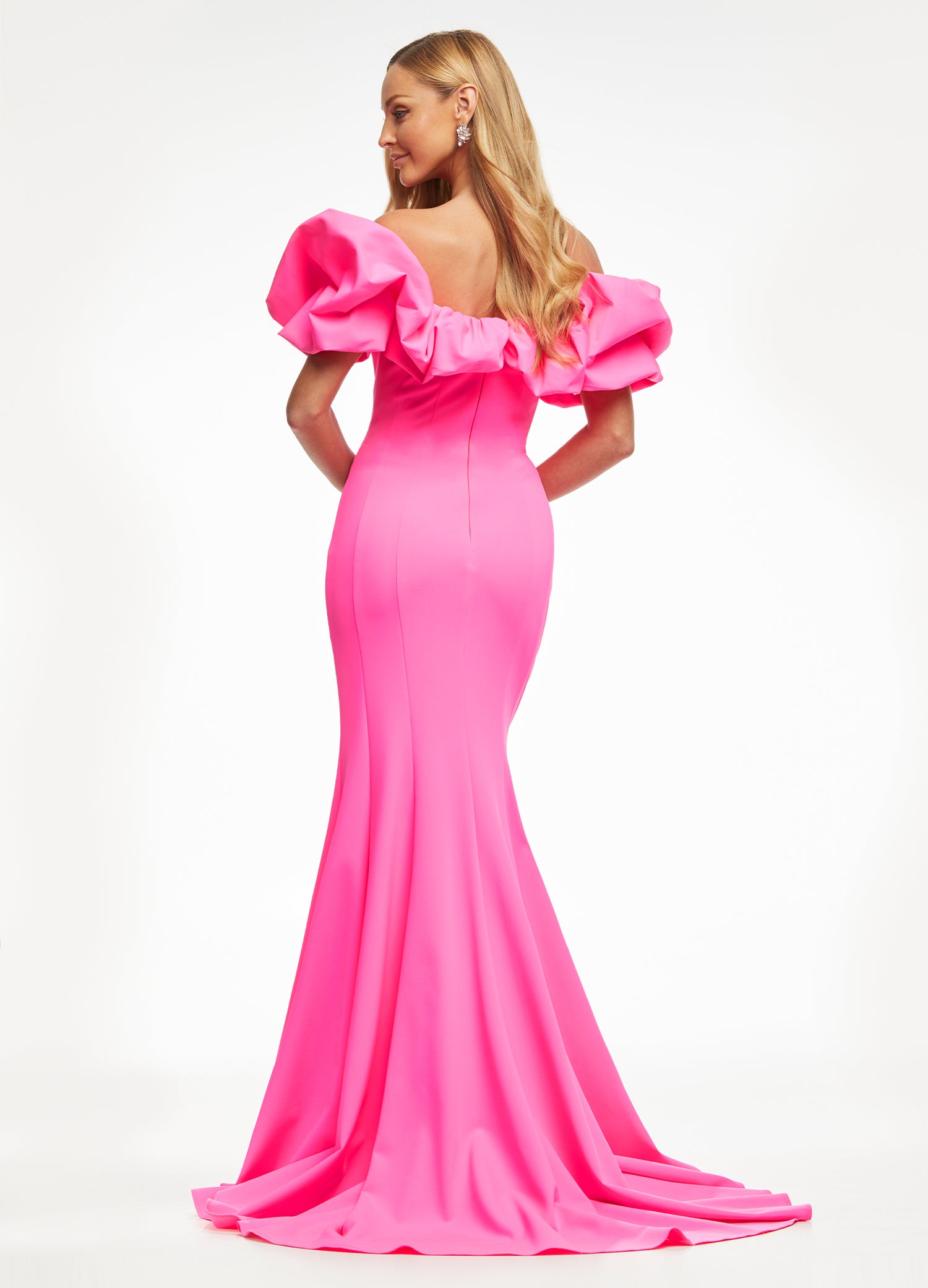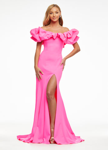 Wow in this off-shoulder scuba evening gown. The off-shoulder neckline is adorned with an oversized ruffle that perfectly frames your face. The fitted skirt is complete with a slit.