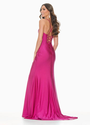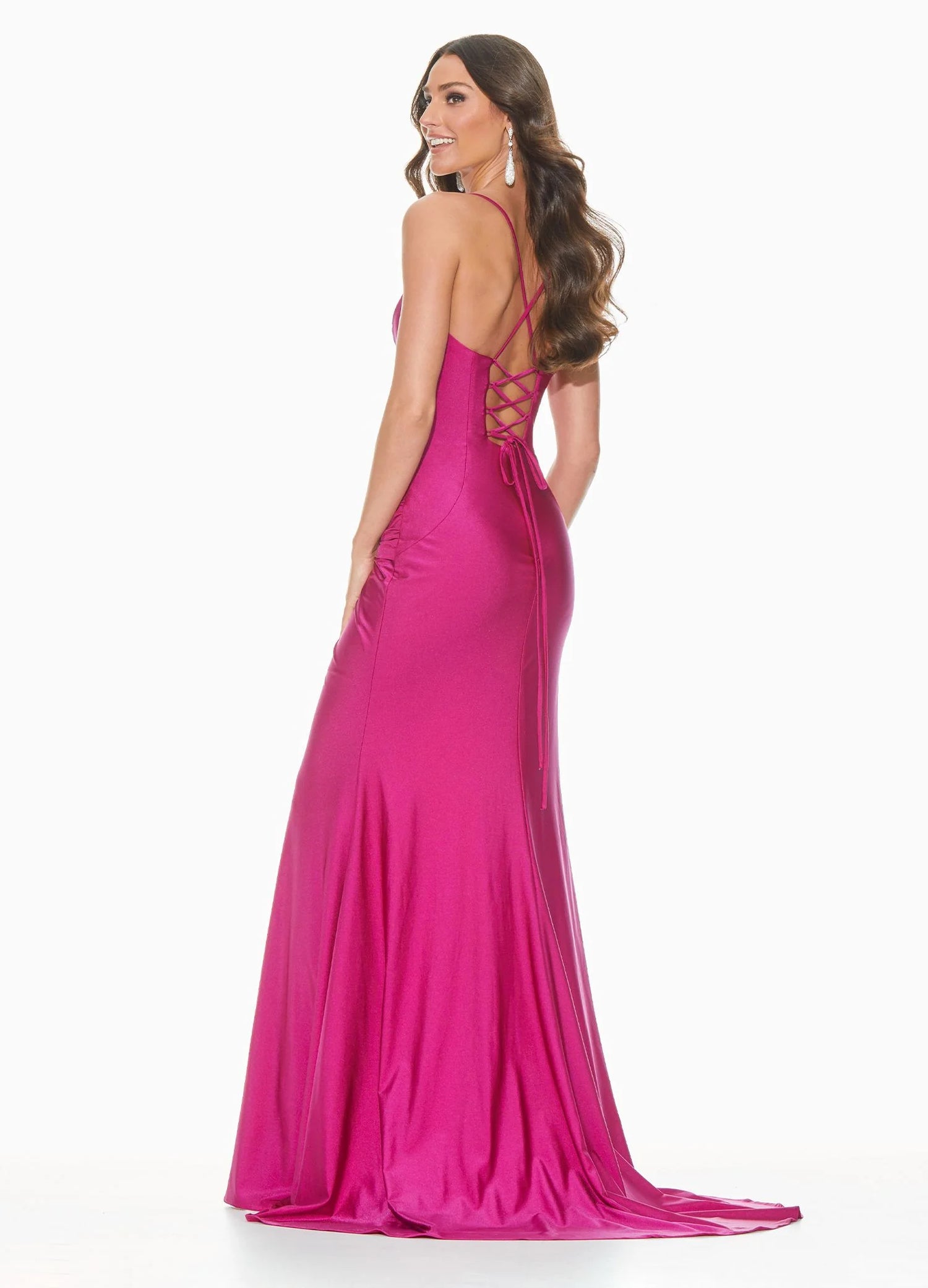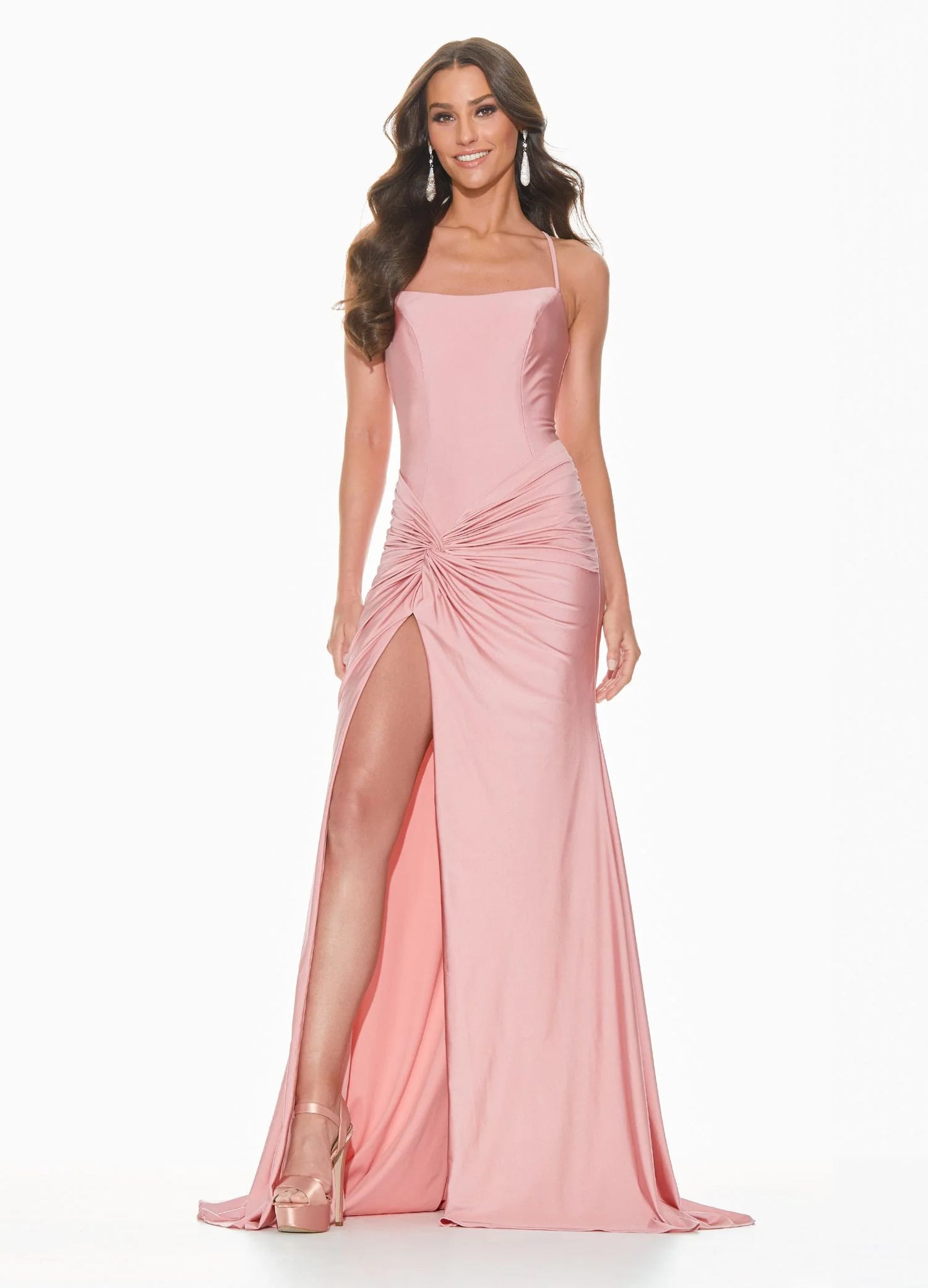 Chic gown with a lace-up back and twist knot detail. The hip is adorned with a twist knot detail that gives way to a right leg slit. The skirt is finished with a sweeping train.