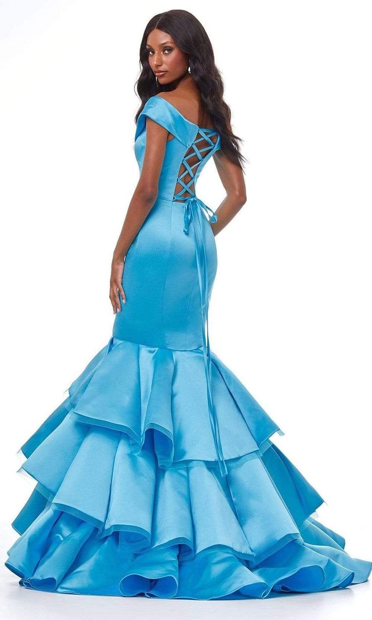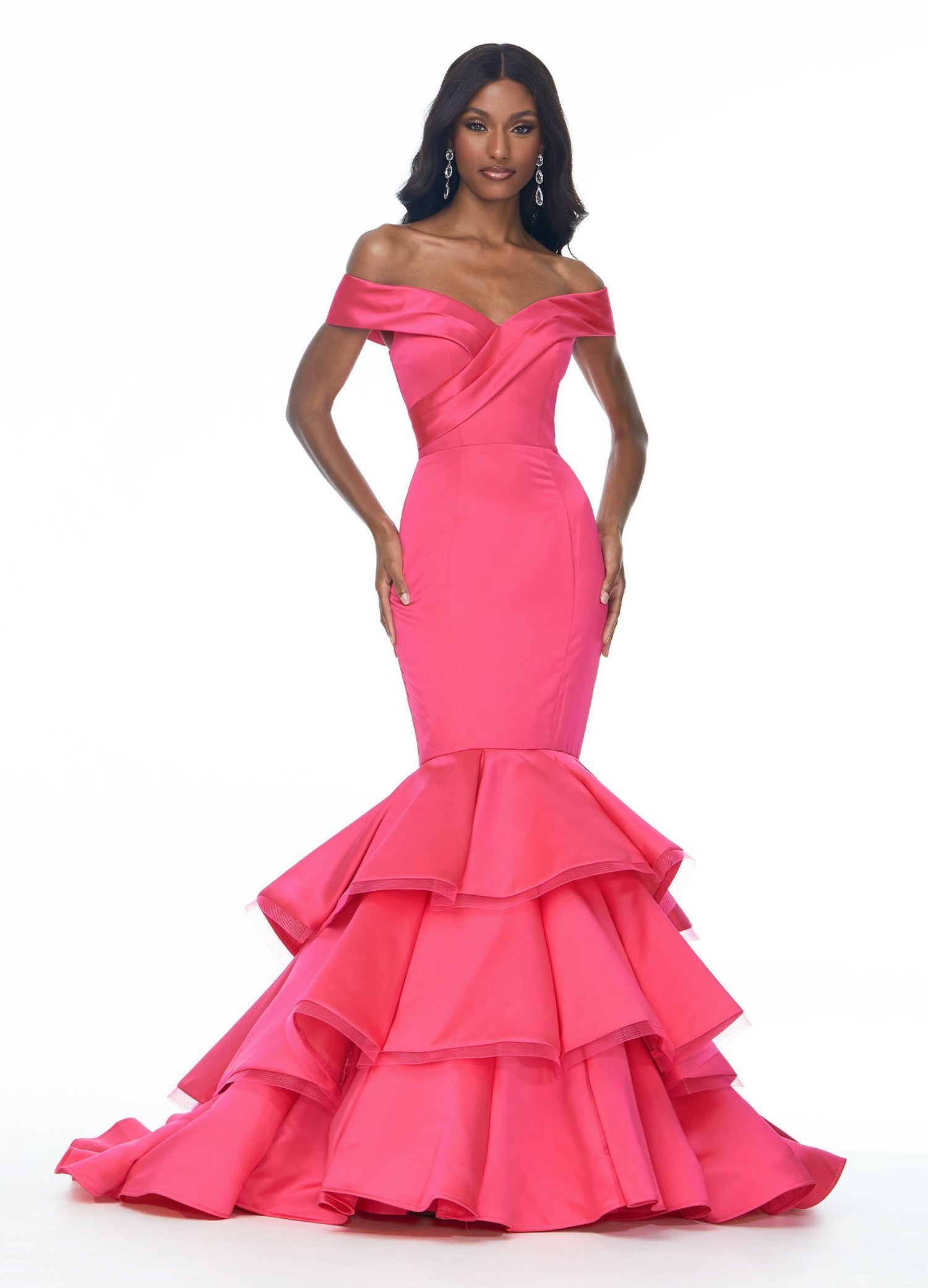 All eyes will be on you in this satin mermaid gown. The wrap-off shoulder detail gives way to a fitted skirt complete with tiered ruffles. The lace-up back is sure to provide you with an exceptional fit.