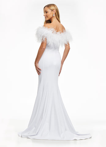 Make a bold statement in Ashley Lauren's classic "11099" dress. This off-the-shoulder fitted gown with a thigh-high slit is further detailed with elegant feathers along the shoulder line for a glamorous look. Perfect for any special occasion!