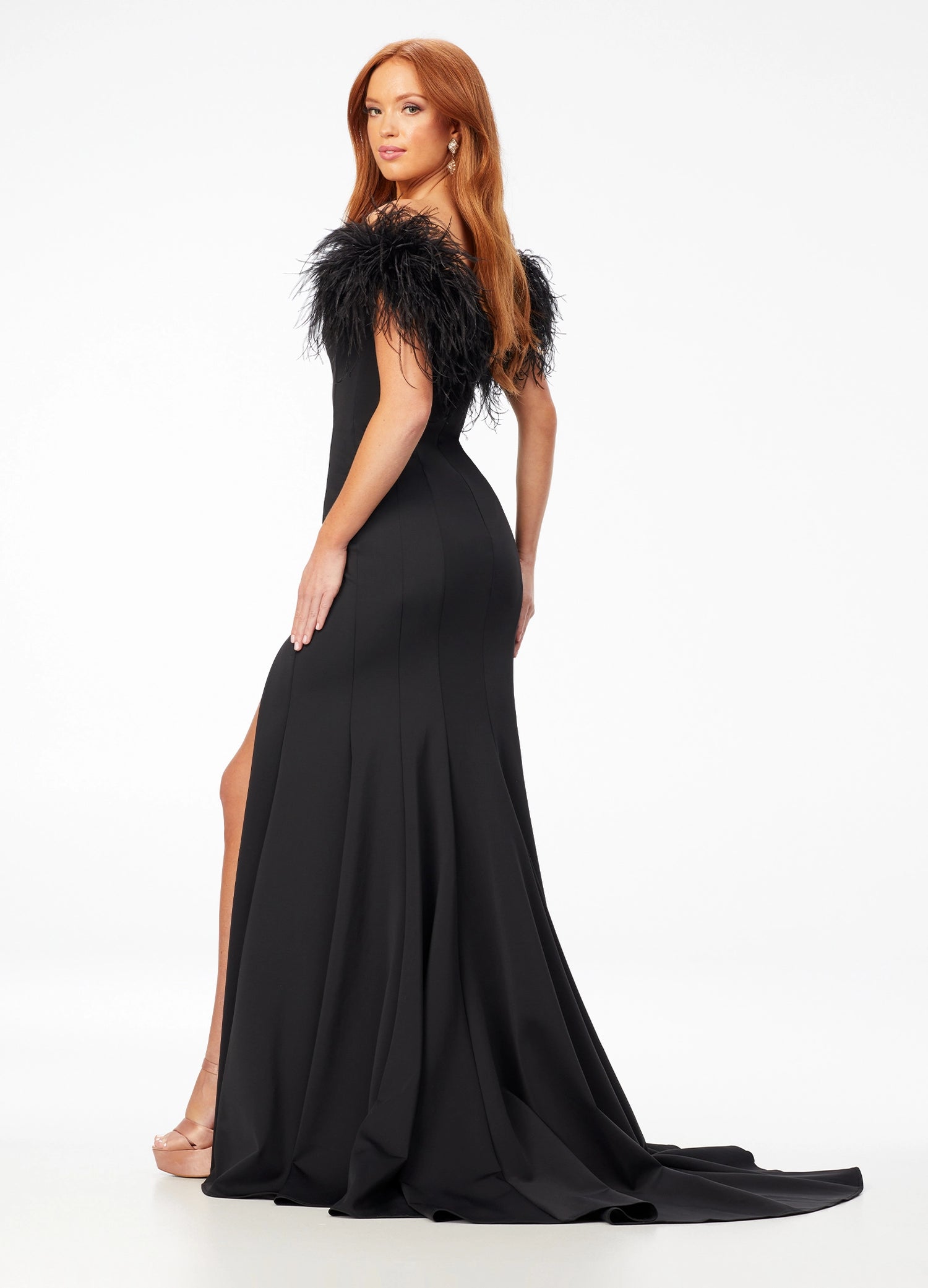 Be the star in this scuba off shoulder gown. We are living for the sweetheart neckline and feather details!