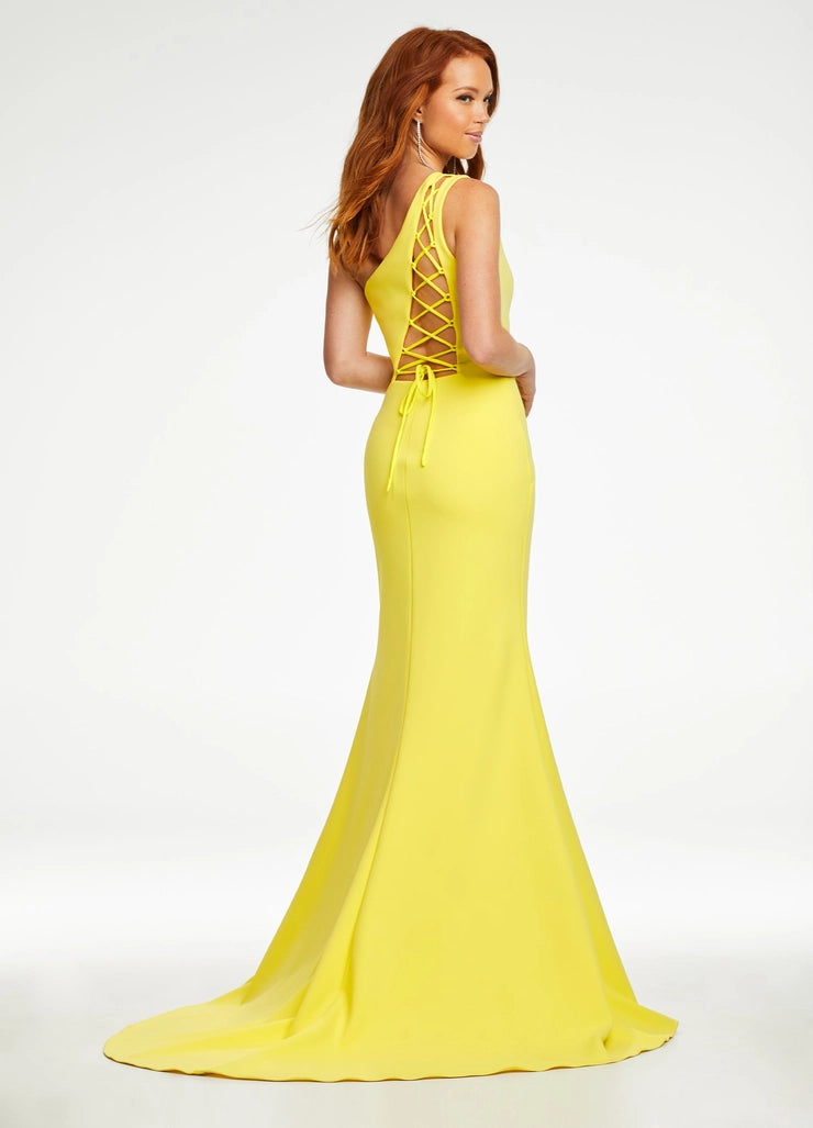 Turn heads in the ASHLEYlauren 11119! This stunning one shoulder evening gown features a sexy high slit and a beautiful lace up back, perfect for prom, pageants, or Mardi Gras balls. With its elegant train, you'll feel like a true queen wherever you wear it!