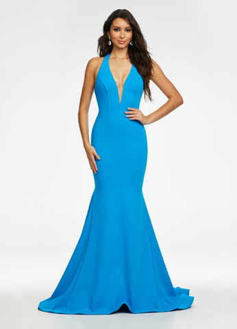 This stunning halter gown is our signature corset fabric to provide you with the perfect silhouette. The halter bustier is adorned with a low plunge and illusion mesh. The skirt is accented with a full sweeping train.