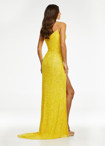 This ASHLEYlauren 11143 gown is perfect for a night out. It features a strapless sequin exterior with a built-in corset for an extra touch of elegance. An elegant slit adds a touch of sophistication, making it the perfect choice for special occasions.