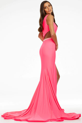 This ASHLEYlauren 11169 one shoulder jersey gown exudes sophistication and elegance. Crafted from comfortable jersey fabric, this sleek design features a breathtaking cut out detail on one shoulder and a thigh-high slit, adding a touch of drama. Perfect for your special event.