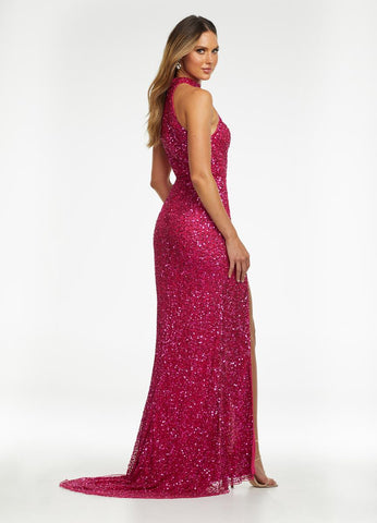 The AshleyLauren 11174 gown is an elegant and sophisticated option for any special event. Crafted with a halter top and sequins, the full-length dress features a right leg slit and full back for comfort and ease of movement. Capture the spotlight in this glamorous halter top sequin gown.