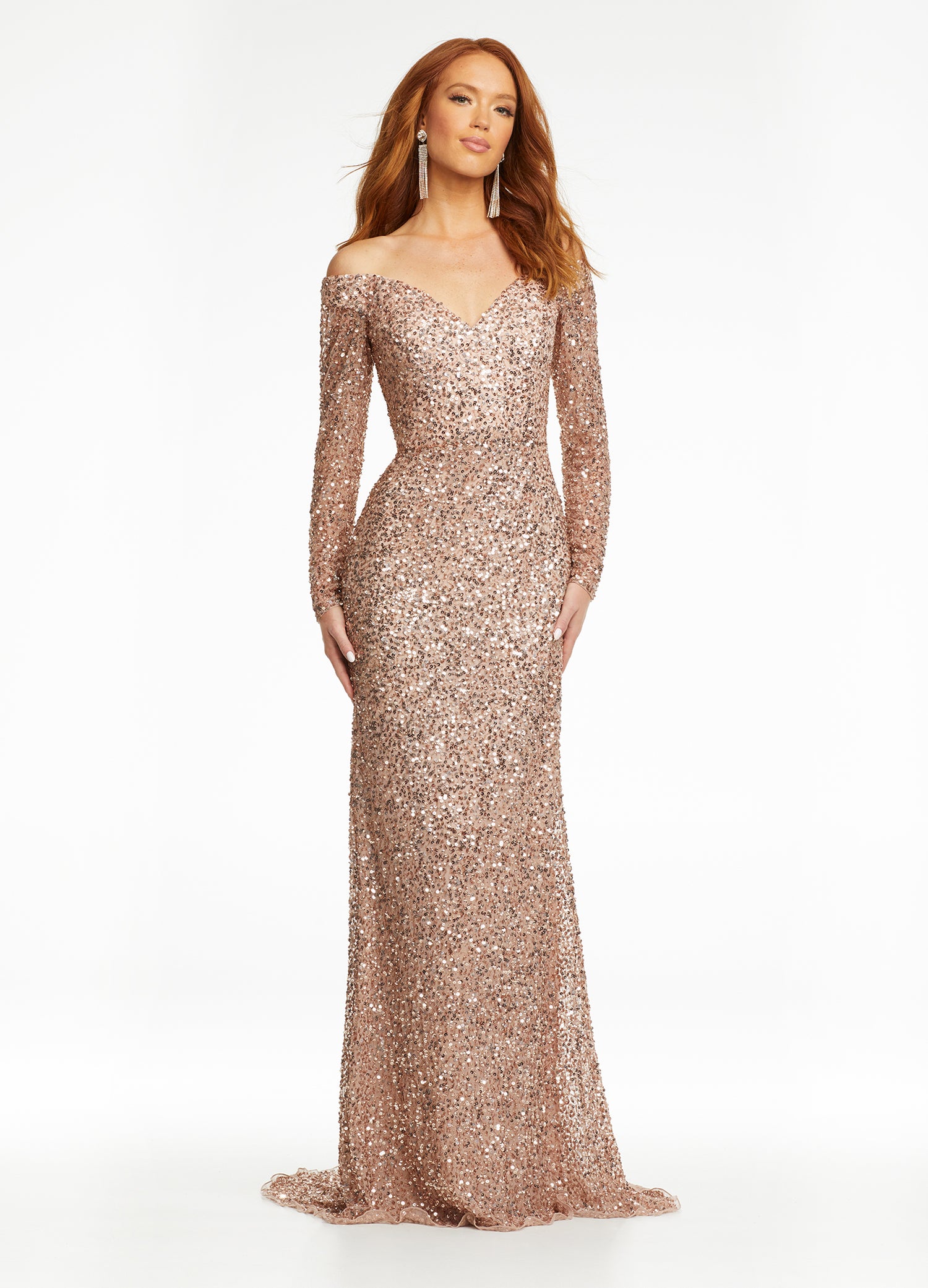 Bring the drama in this off the shoulder sequin gown with sleeves. The look is completed with an inner corset and sweep train.