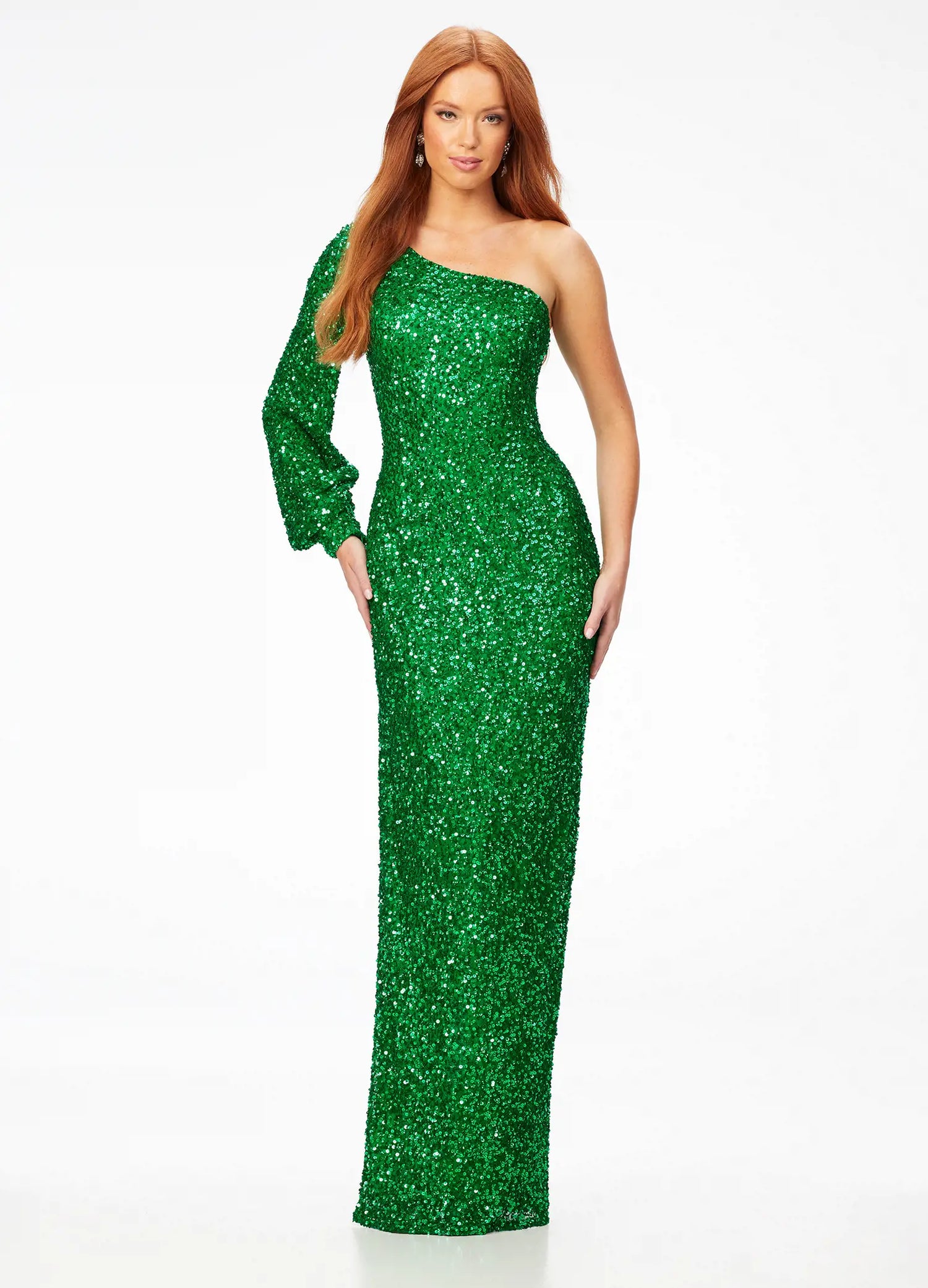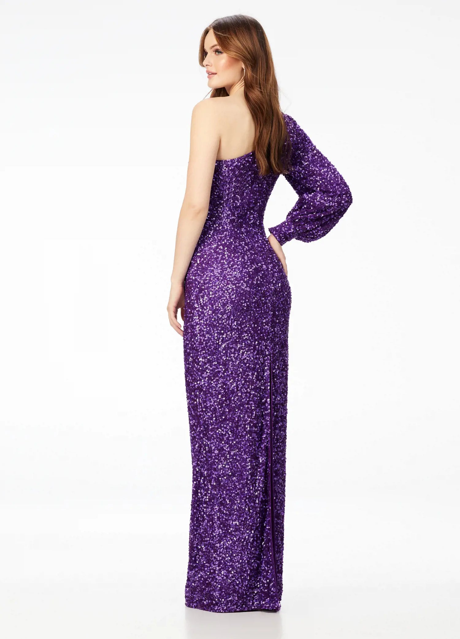 This gorgeous sequin gown features a one shoulder neckline dress features a bishop sleeve and a fitted column skirt with back vent.