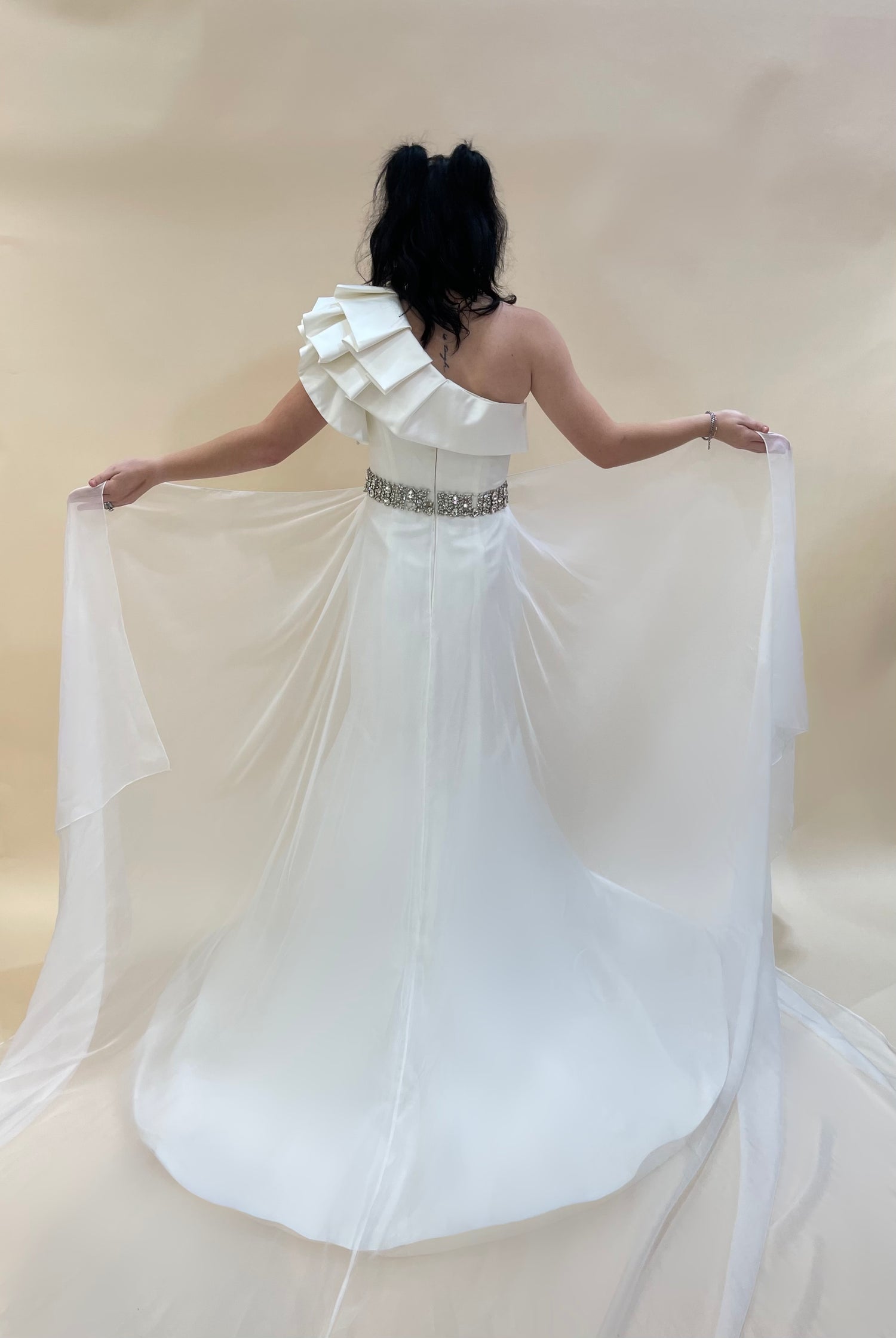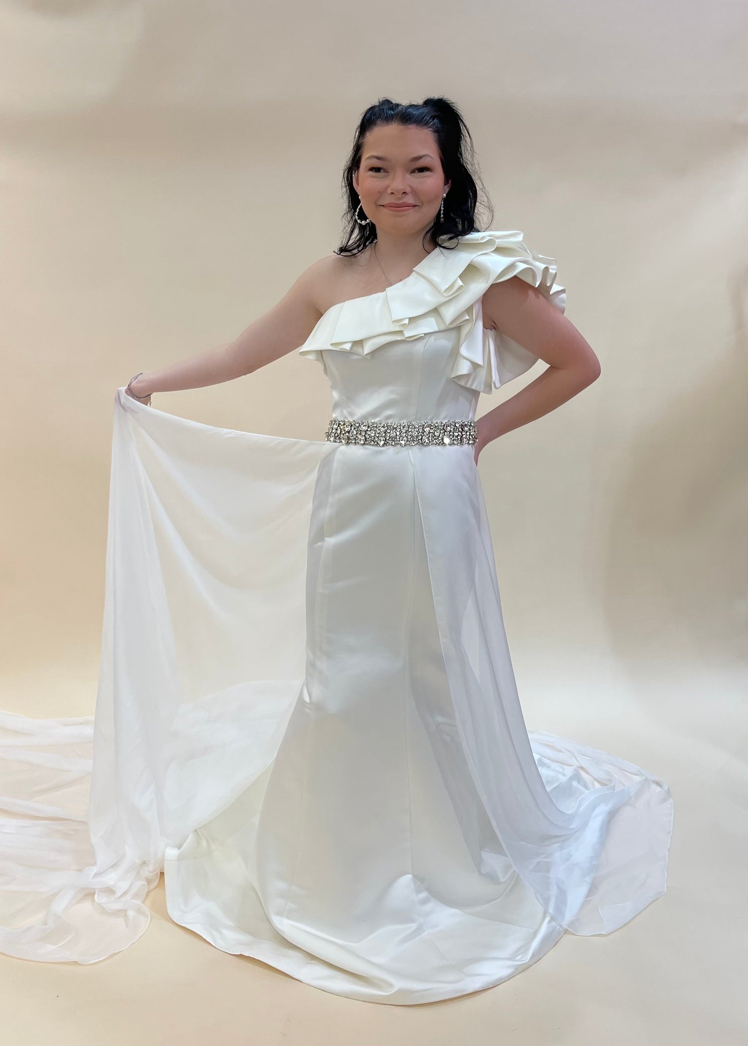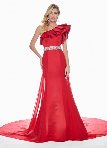 Look your best in the ASHLEYlauren 1398, a one-shoulder mermaid-style formal dress. Ideal for special occasions, this dress features a cape at the waistline, a rhinestone-embellished belt, and ruffles on the shoulder for a touch of glamour. You'll turn heads with this show-stopping look.