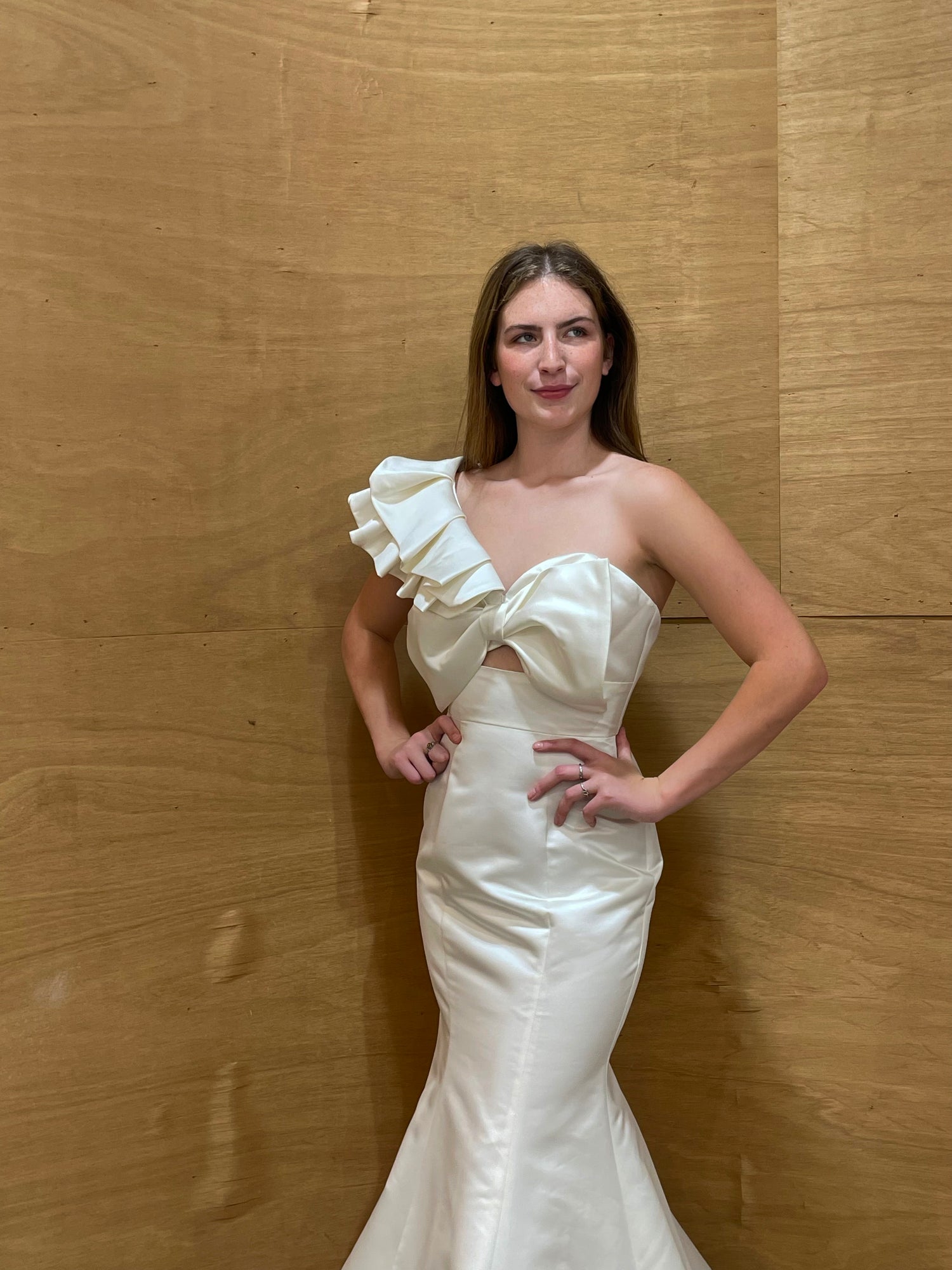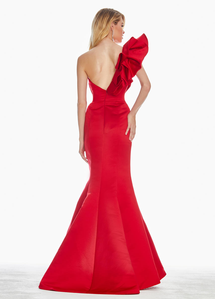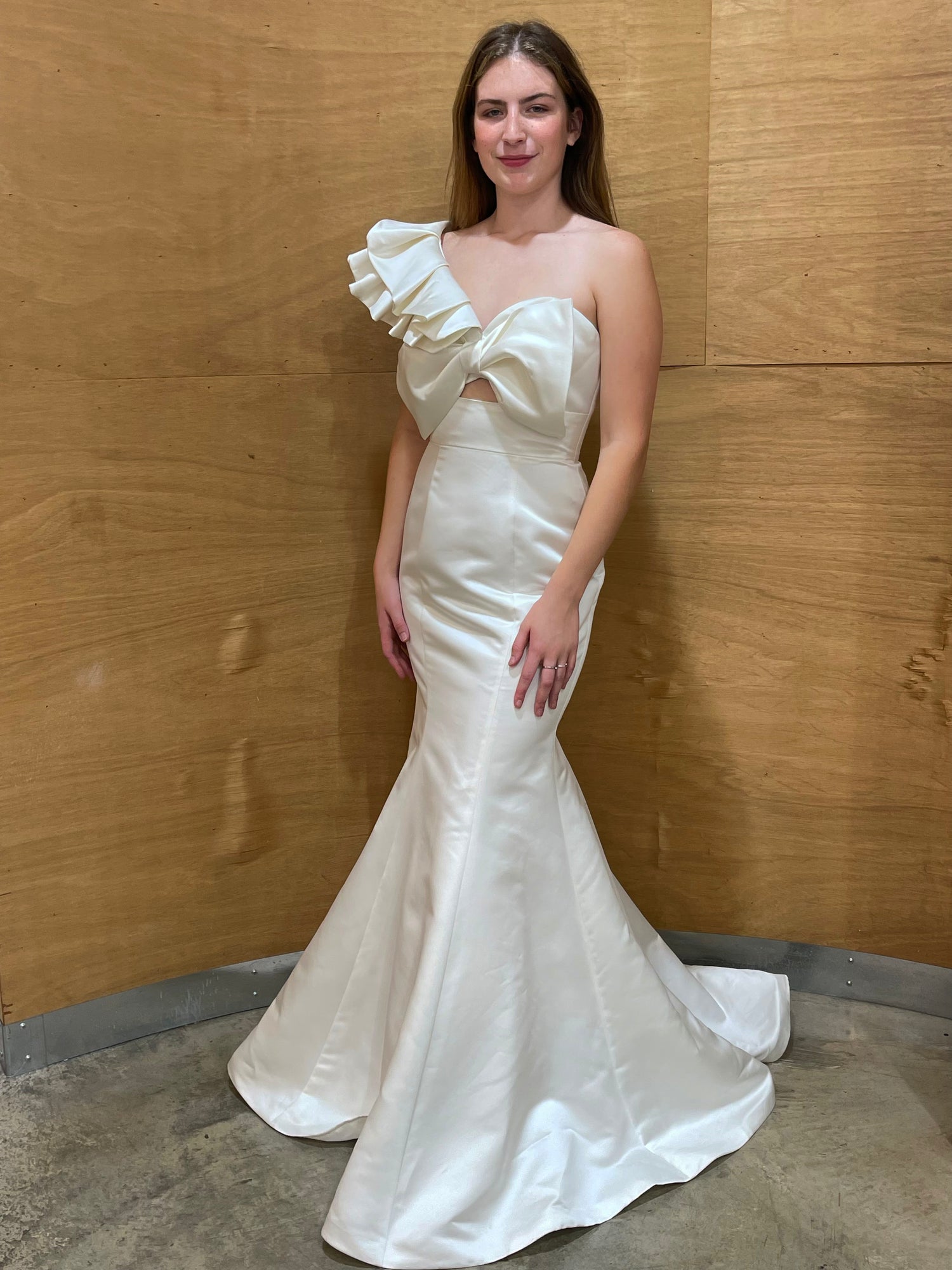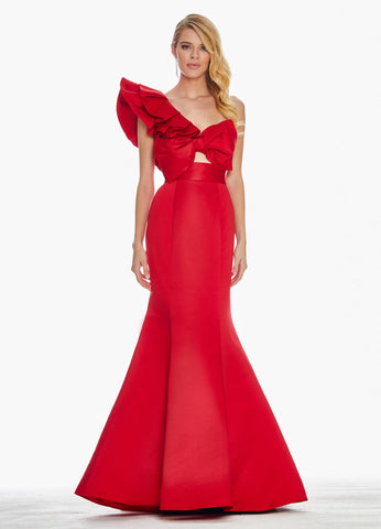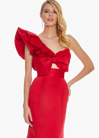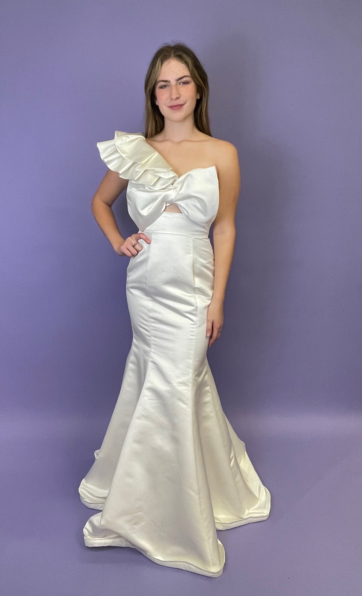 Make a statement in this asymmetrical, one shoulder, evening dress. The ruffle one shoulder strap and bow bustier add a modern twist to this long gown. The bustier is complete with a sexy cut out.