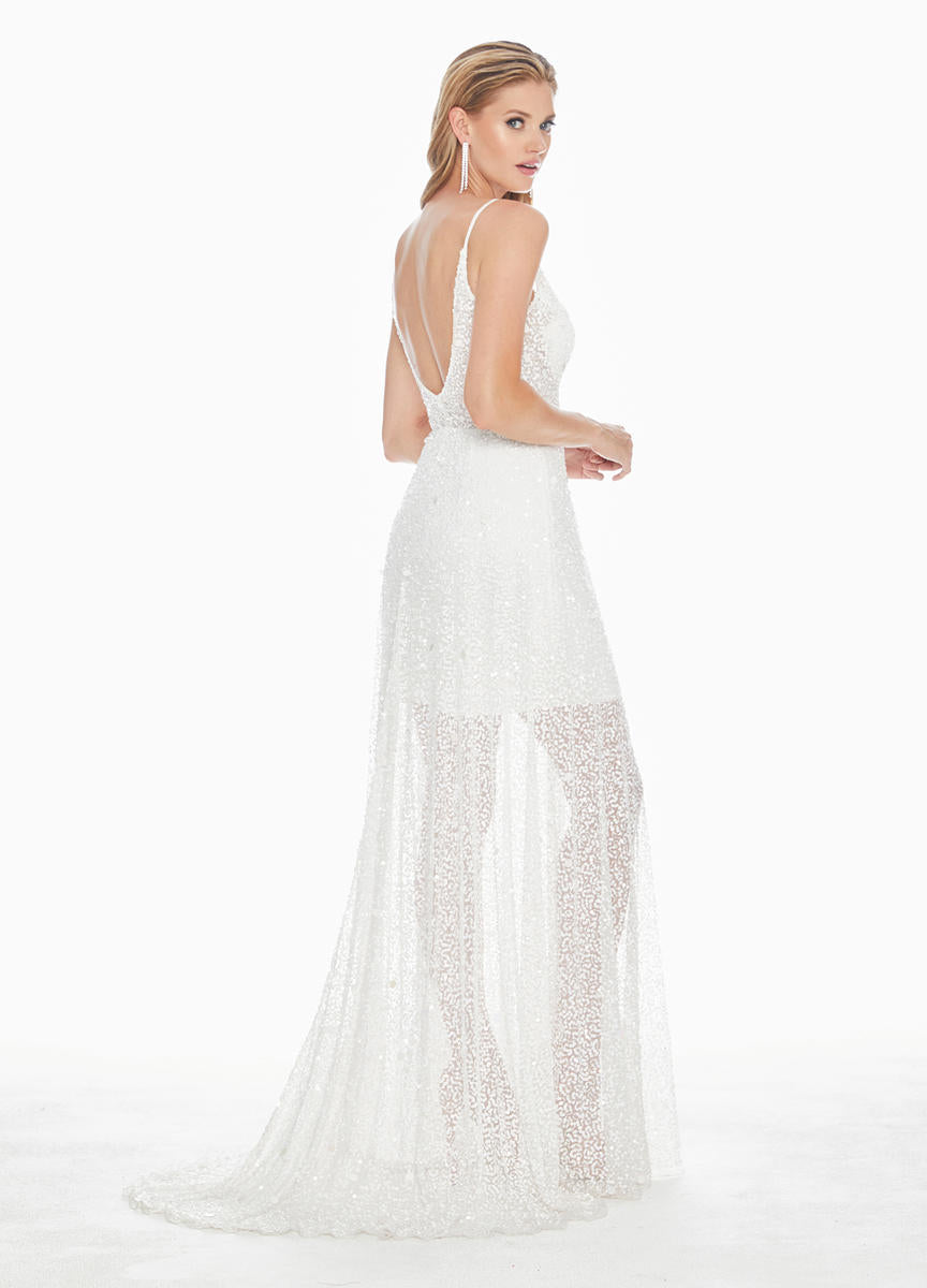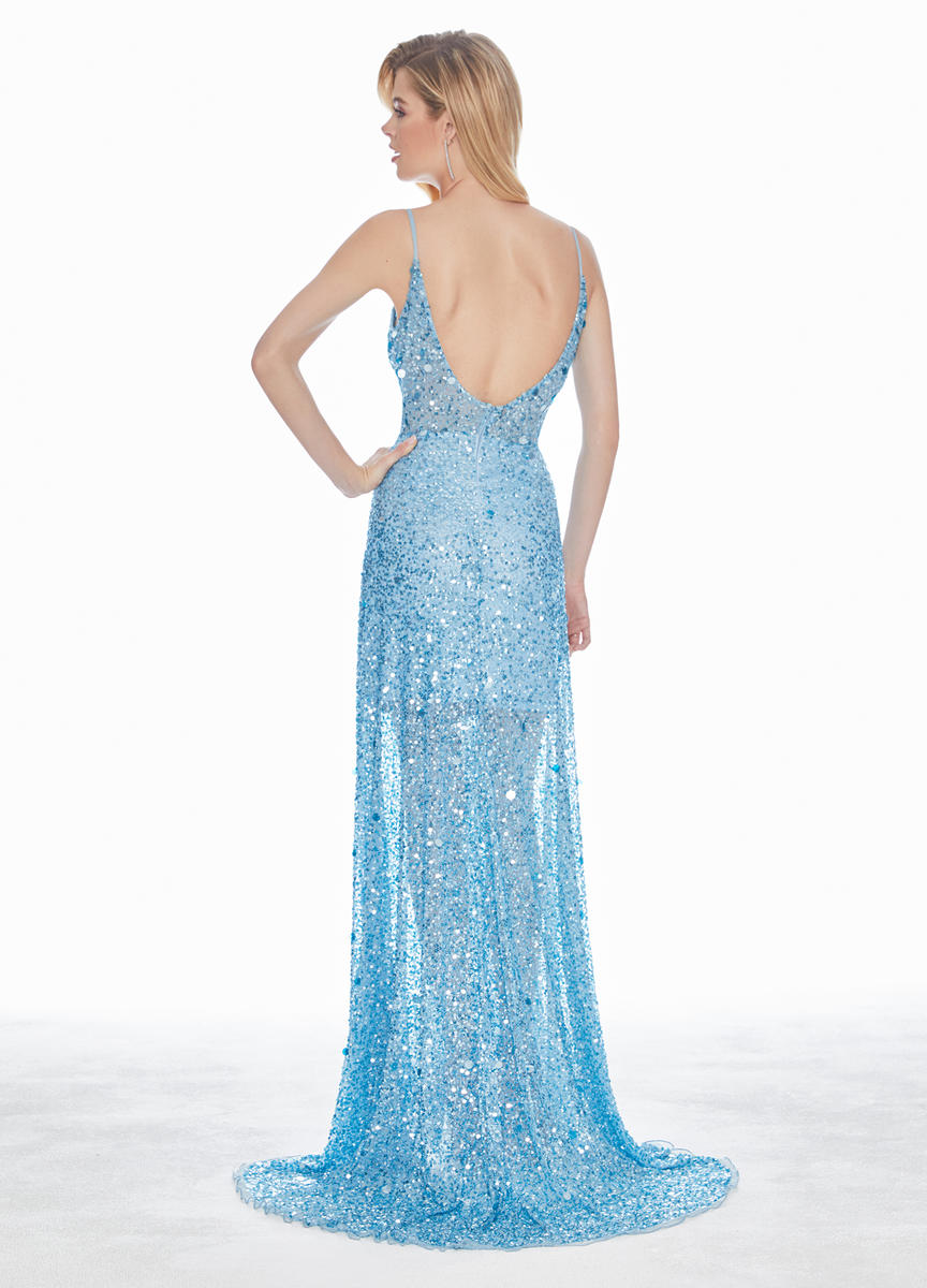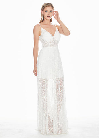 Be the belle of the ball in this shimmering A-line evening dress! The gorgeous bustier has a plunging V-neckline and spaghetti straps. The intricate beading of the skirt cascades to the floor, while the jersey lining flows elegantly above the knee.