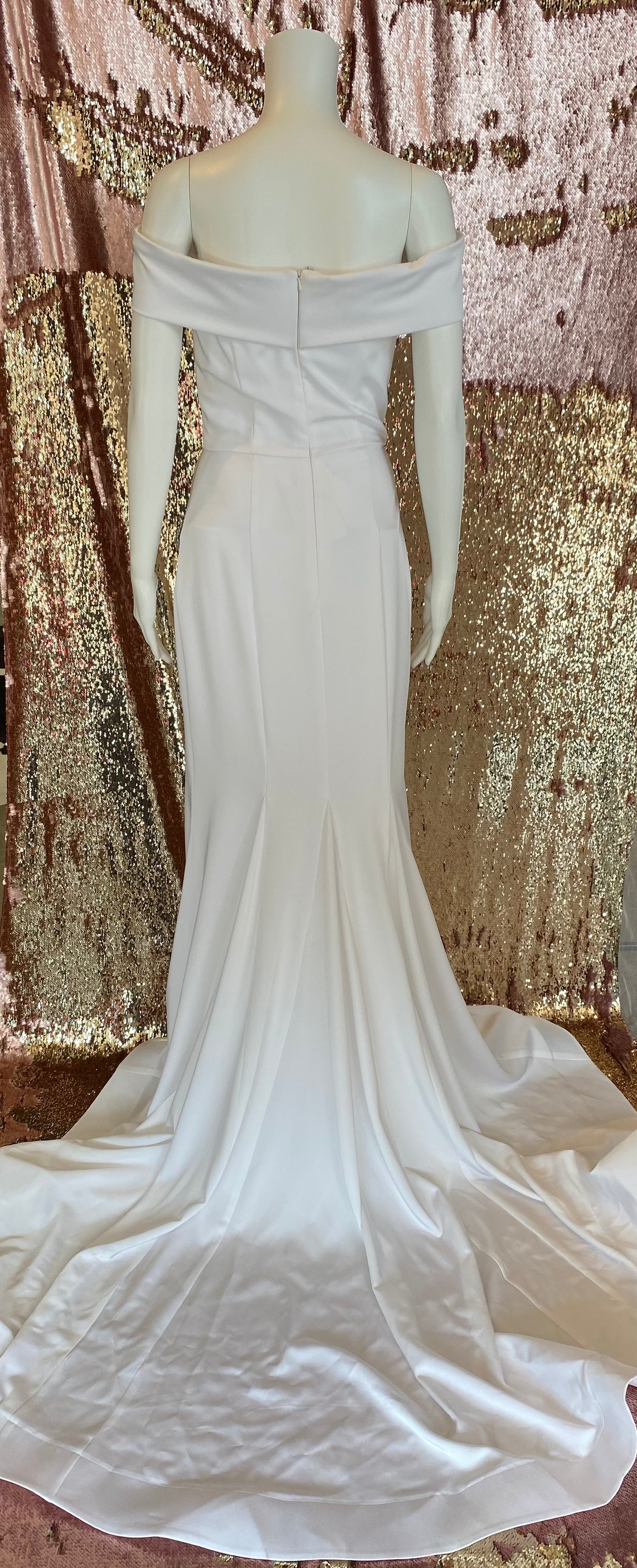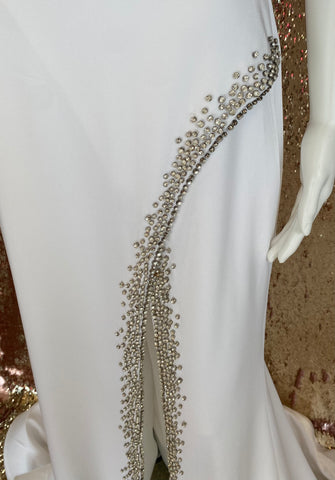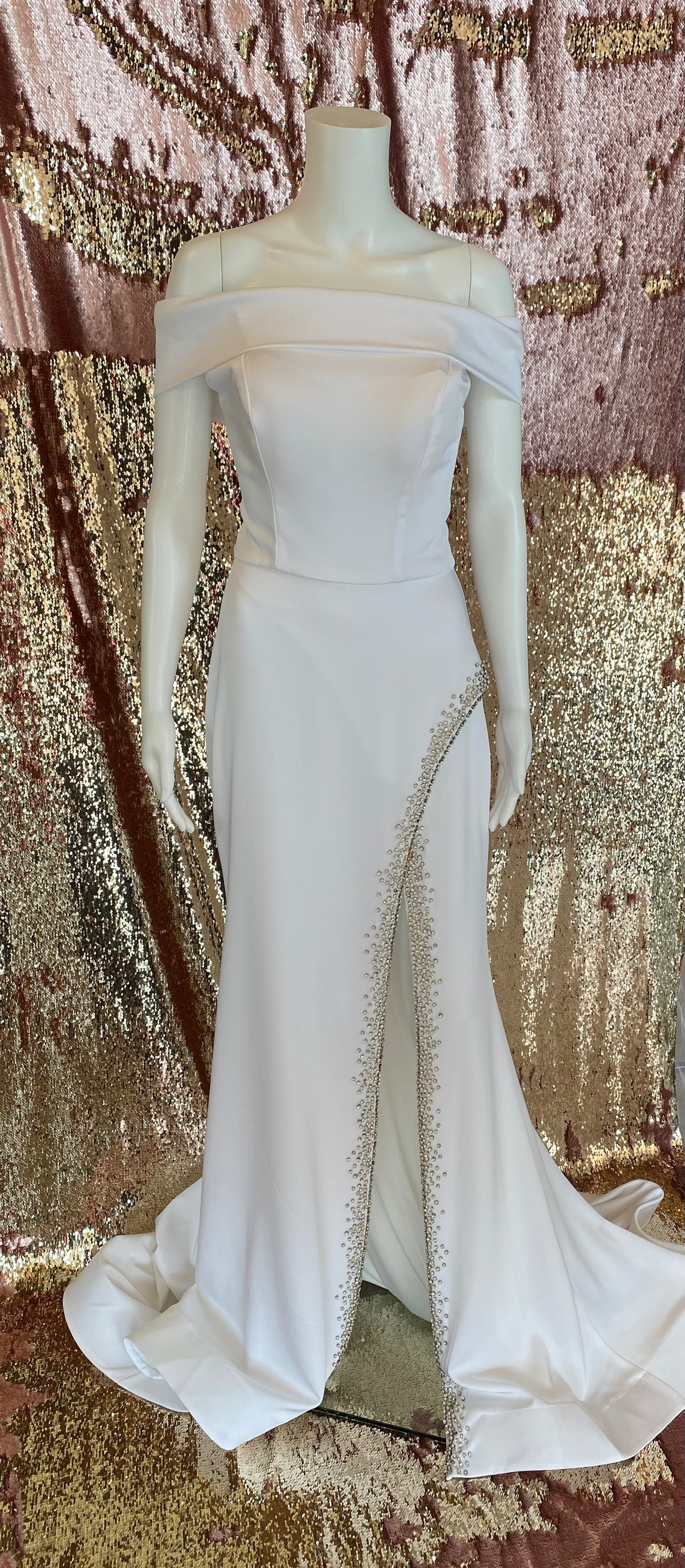 This ASHLEYlauren 1596 formal gown is crafted with an off the shoulder silhouette with a bold side slit. The gown is adorned with rhinestone detailing and a sweeping train. The timeless design is perfect for any special occasion.