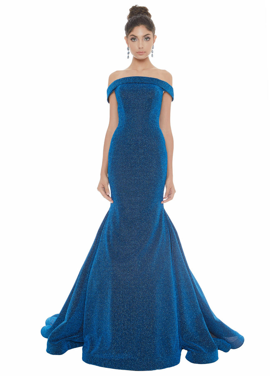 Dazzle in this mermaid off the shoulder metallic evening dress. The beautiful metallic scuba fabric, sweep train and elegant off the shoulder neckline are sure to make a statement.
