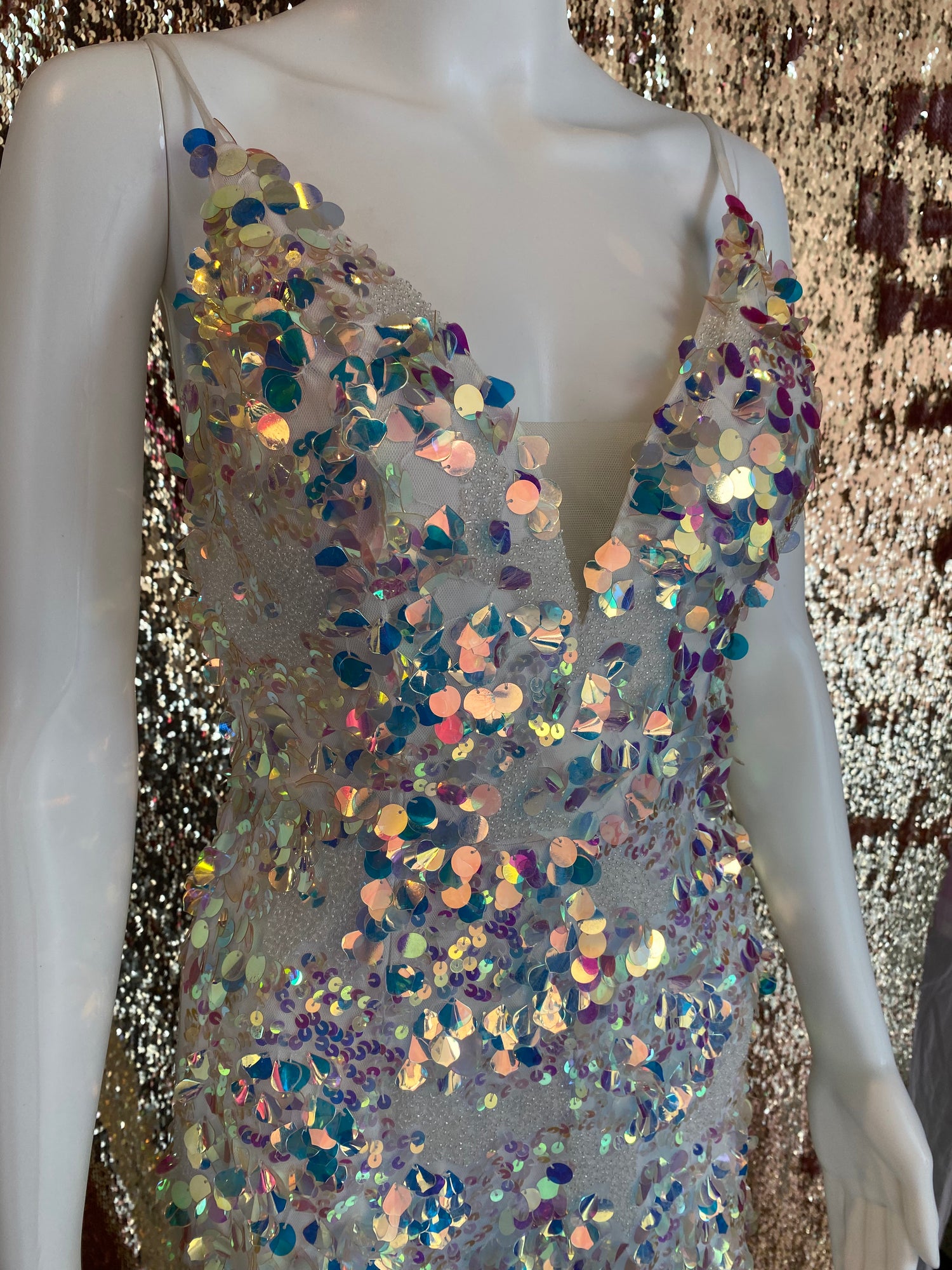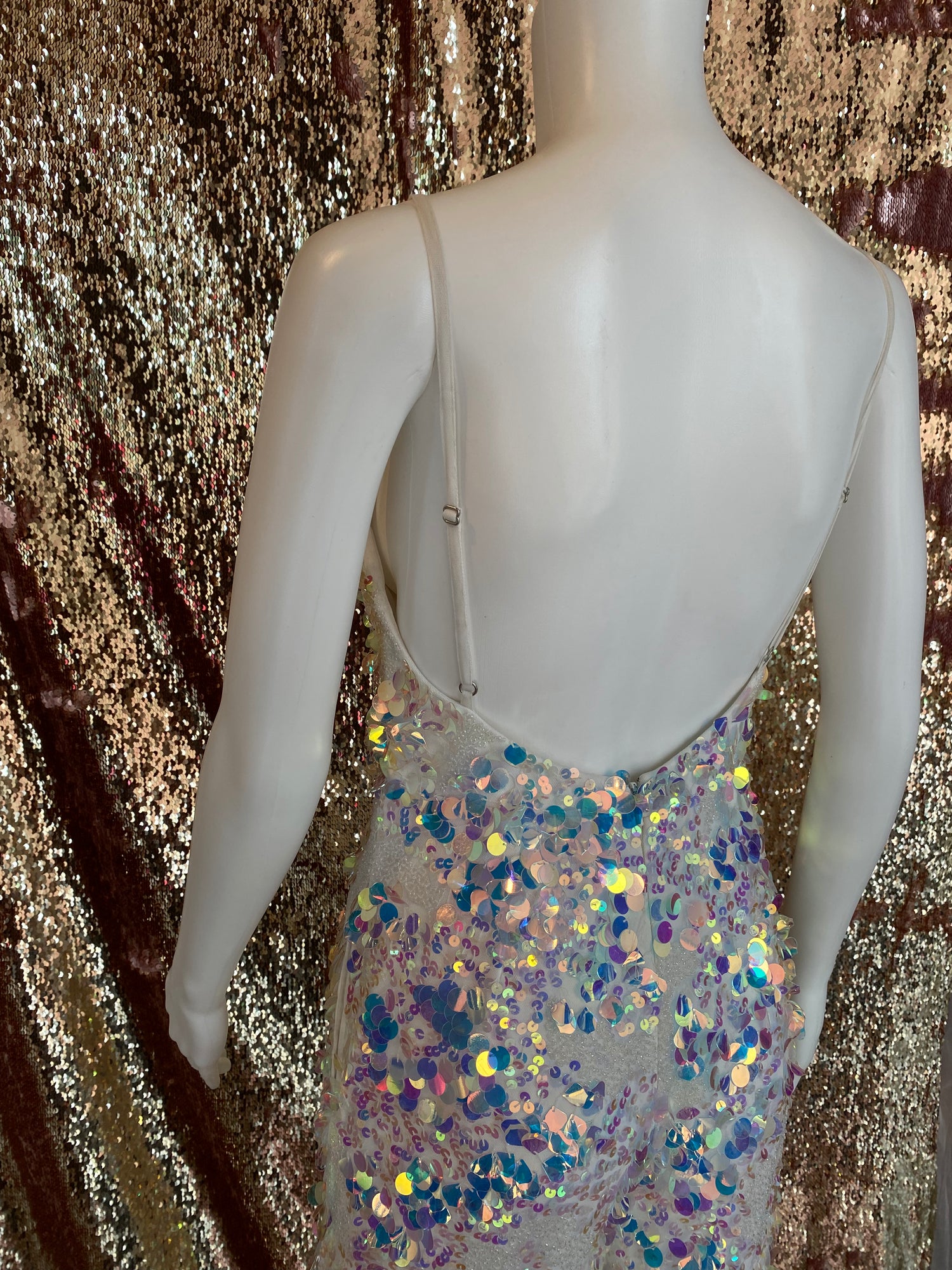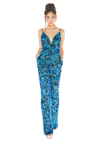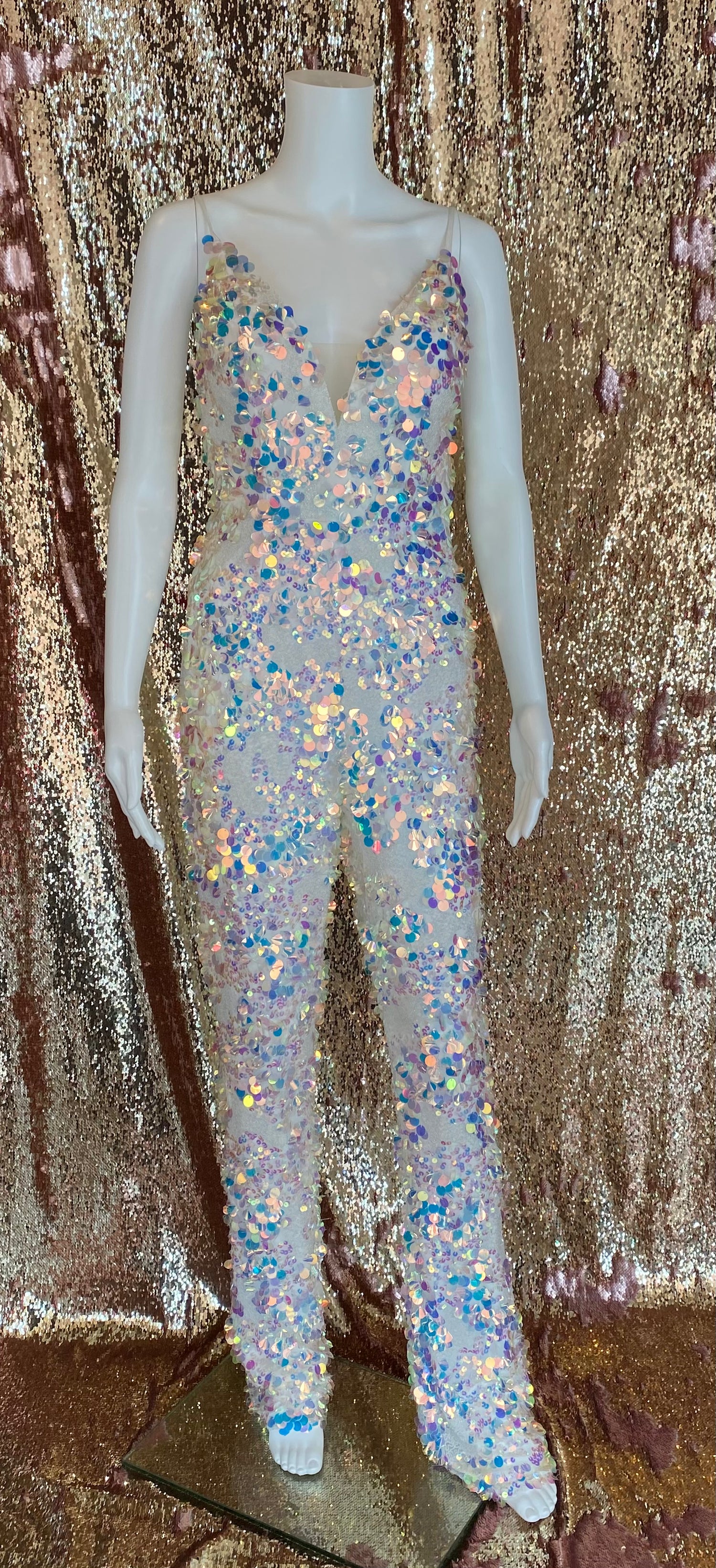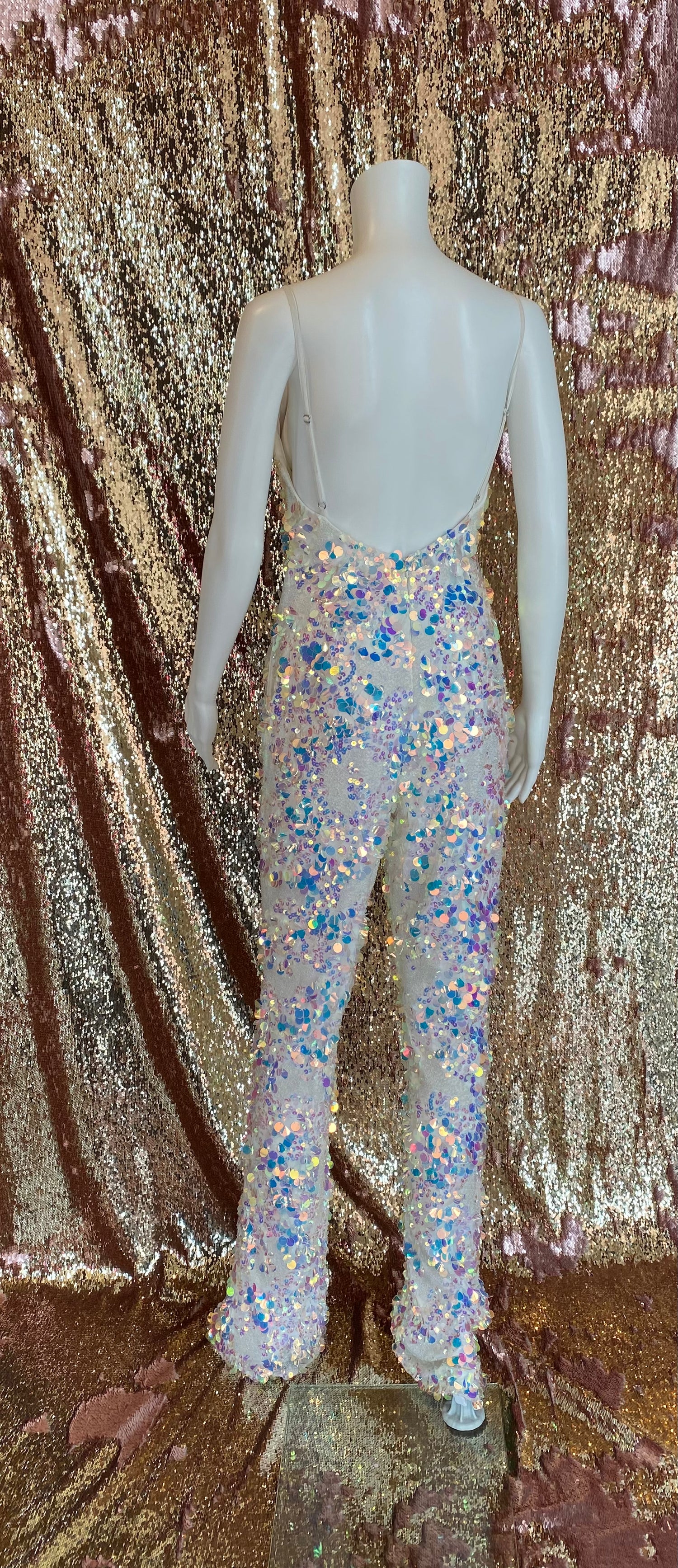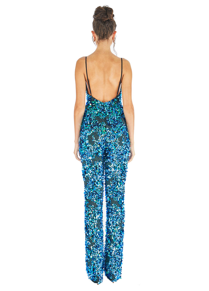 Dance the night away in this fun beaded jumpsuit. The mixture of small sequins and paillettes create dimension and movement that will leave all eyes on you.
