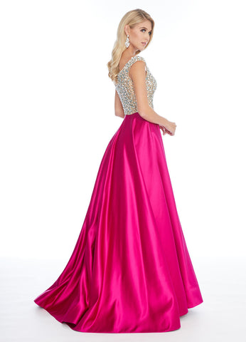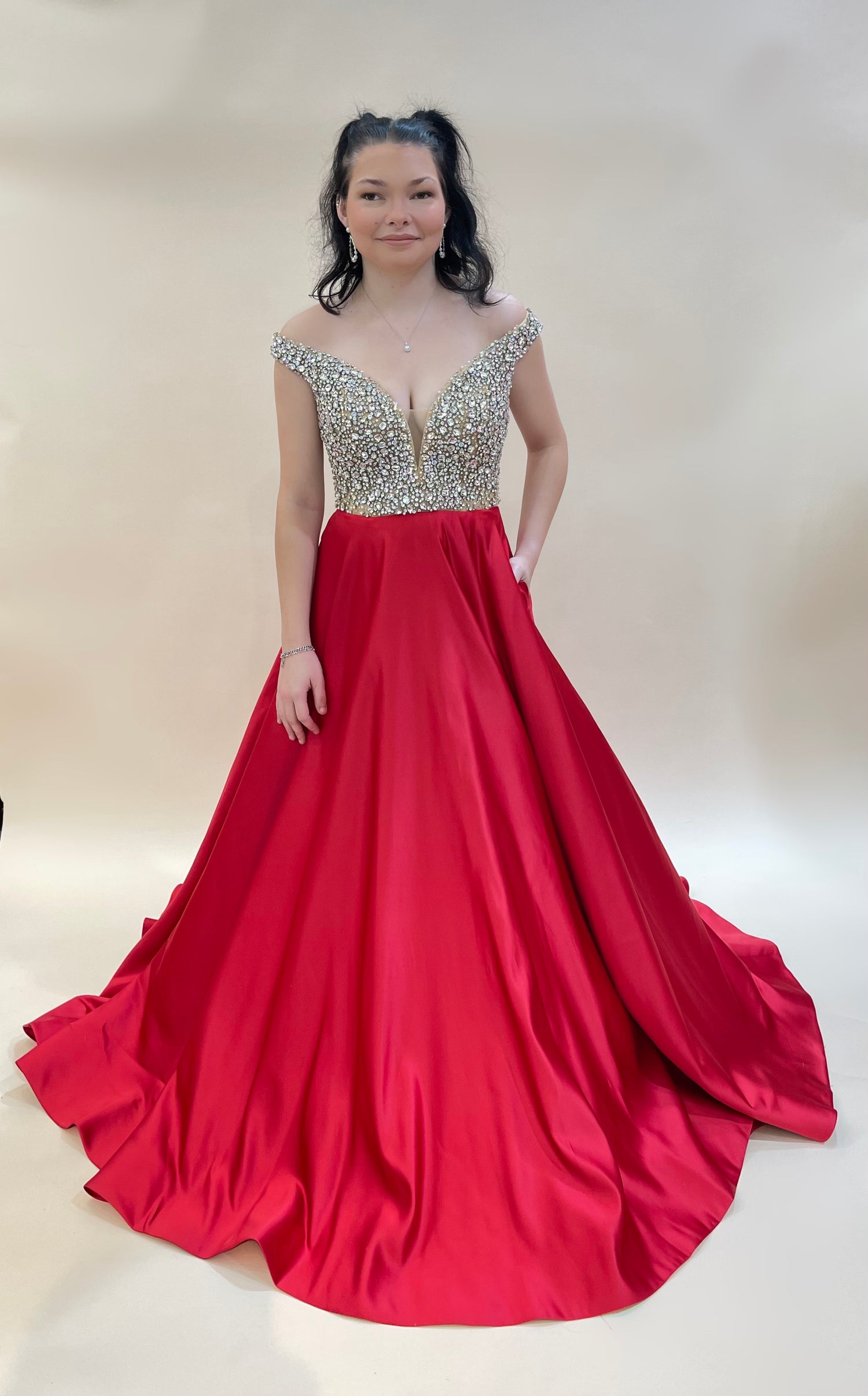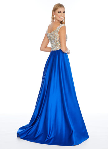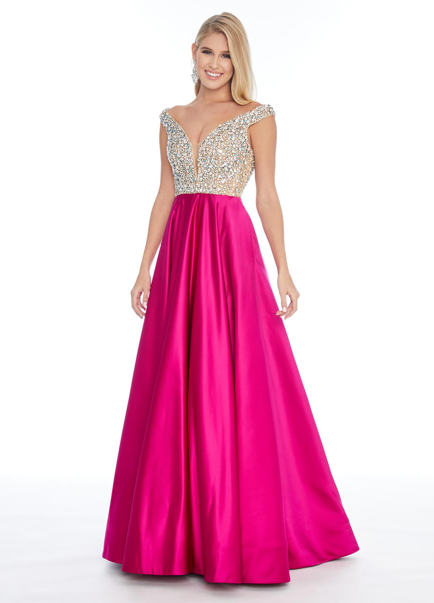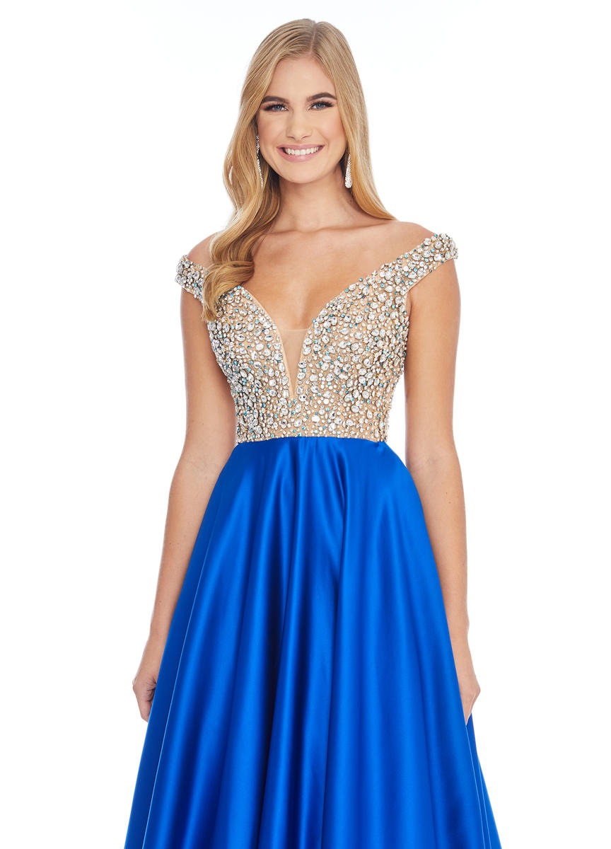 Look breathtaking in ASHLEYlauren 1792. This off-the-shoulder ballgown features a fully encrusted crystal bustier sure to make a statement. With an artistic and timeless design, this gown will make you the highlight of any event.