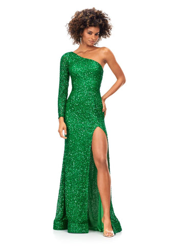 ASHLEYlauren 1977 one sleeve fully beaded gown is a timelessly elegant and sophisticated dress. Its fitted design and shining beadwork, along with the left leg slit and horsehair hem, combine to create a stunning statement piece perfect for any event.