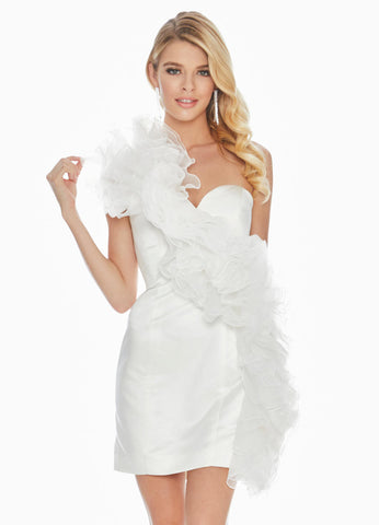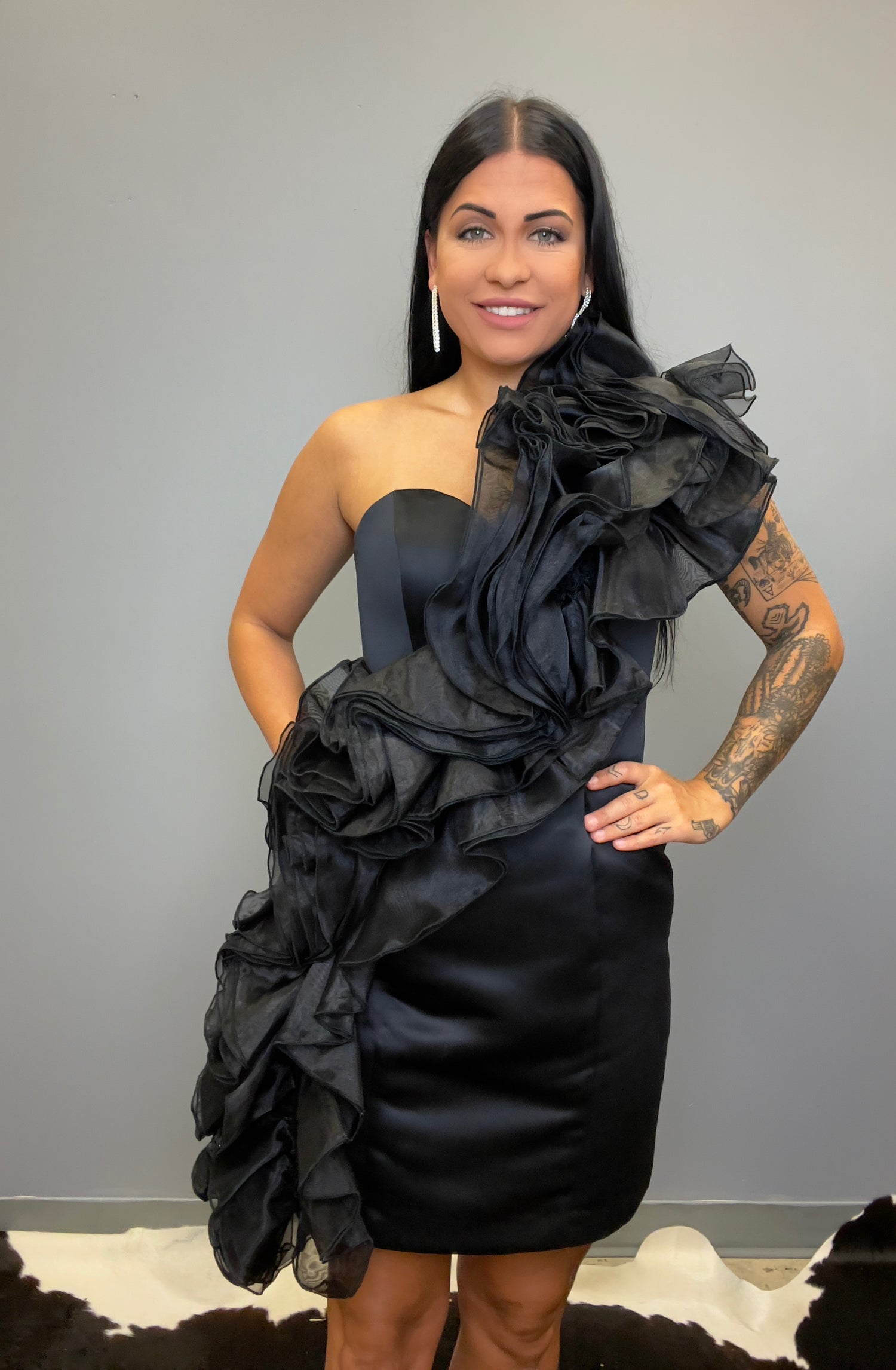 Make a statement in this satin cocktail dress with organza ruffle. The satin cocktail dress has a sweetheart neckline and mini skirt. The oversized organza ruffle wraps across the front of the dress.