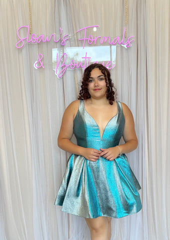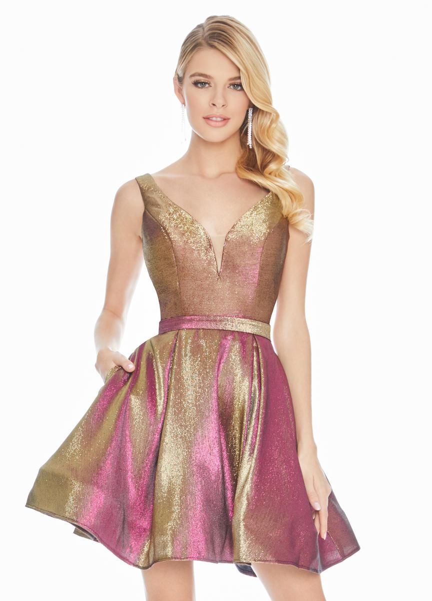 Be elegant and sophisticated in the ASHLEYlauren 4175 dress. Meticulously tailored with a V-neck, waist belt and two pockets, this short formal dress is fashioned from a luxurious metallic fabric. Its timeless design ensures a timeless look for any occasion.