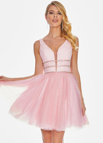 Stand out in this flirty glitter tulle cocktail dress. This V-neckline draws attention to the beaded ladder details.