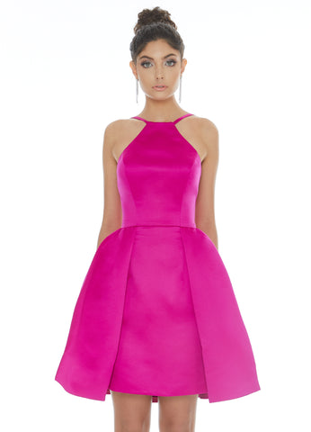 This satin cocktail dress is perfect for your next event. The halter bustier and satin overskirt add a modern flair to this classic silhouette.