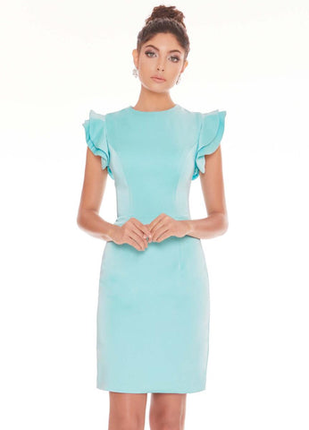 Dress to impress in this crepe cocktail dress. It has a crew neckline and a layered flutter sleeve with a fitted skirt.