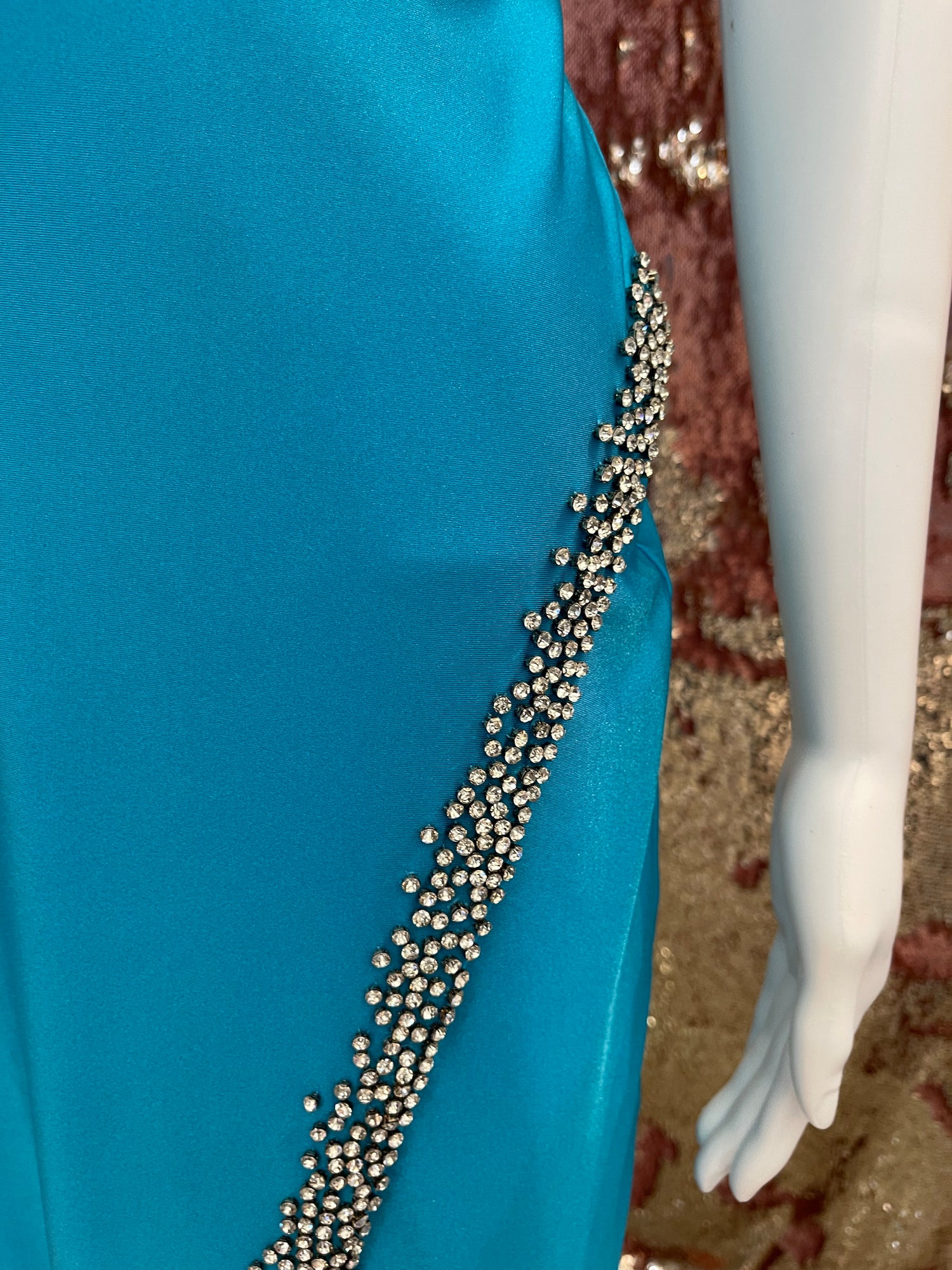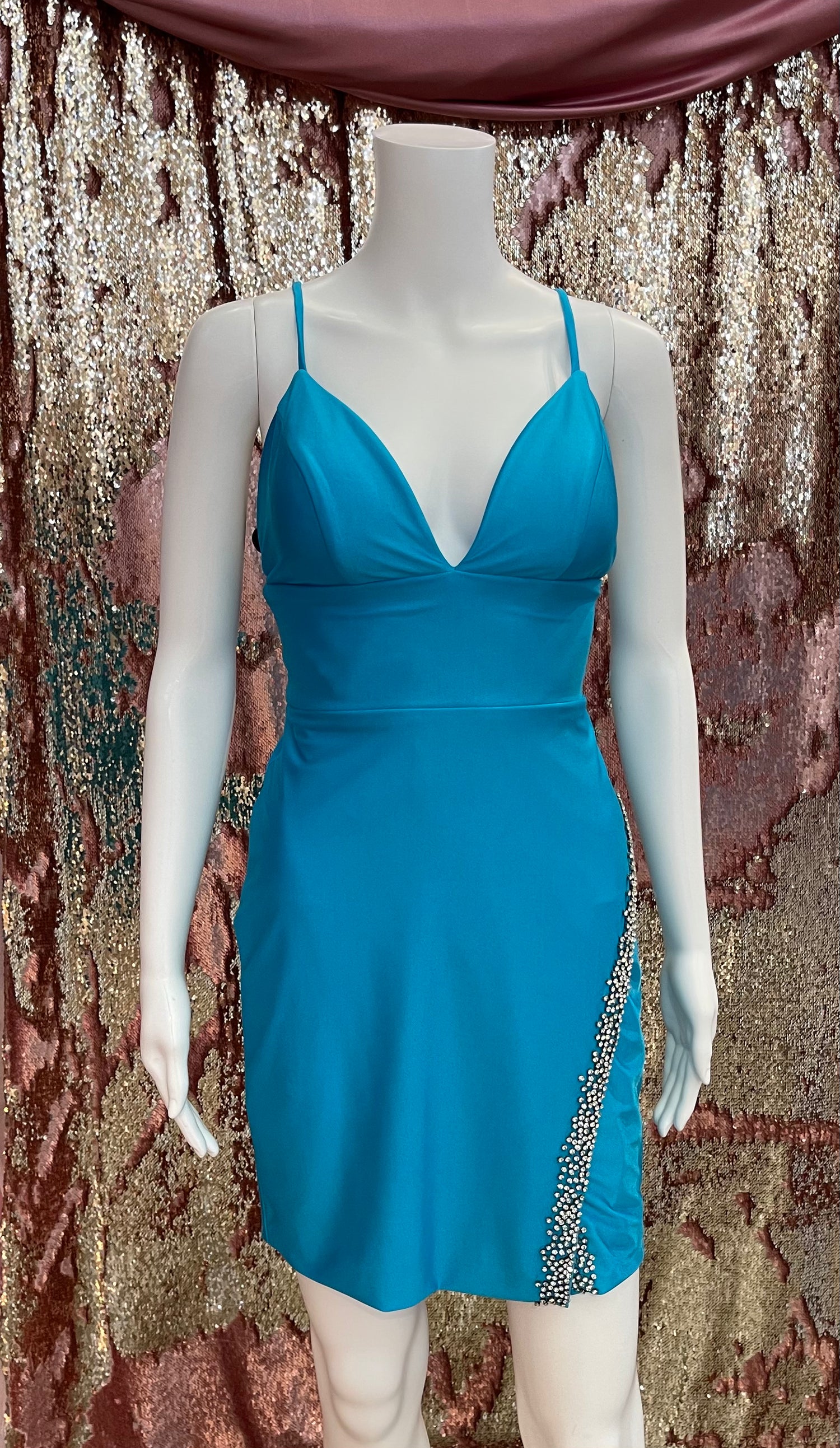 The ASHLEYlauren 4352 is the perfect cocktail dress. Featuring a sophisticated V-neck neckline and high waistline, this dress adds a touch of glamour with its beautiful rhinestone detailing along the skirt. Perfect for any special occasion, this dress is sure to make a statement.
