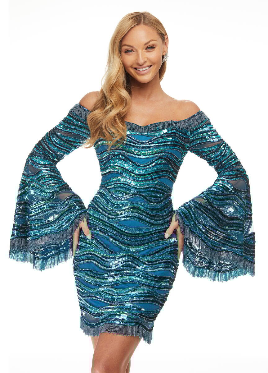 Look stunning in the Ashley Lauren 4440. This exquisite, fully beaded off-the-shoulder dress features beautiful bell sleeves for a classic, timeless look. Perfect for any formal occasion, this dress will have you looking your best.