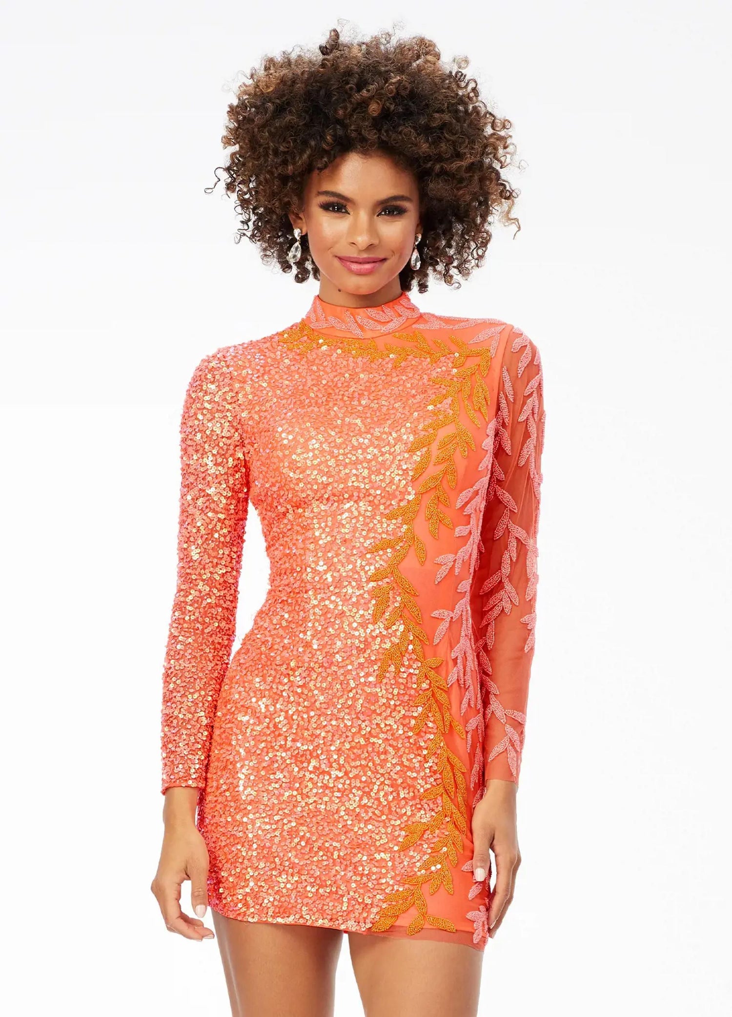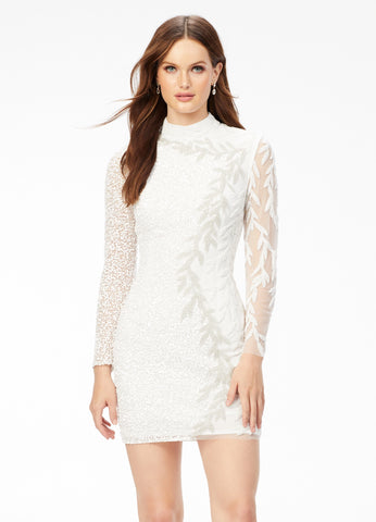 Turn heads with this gorgeous ASHLEYlauren 4504 gown. The chic high neckline with long sleeves is adorned with beautiful cascading leaf beading, while the fitted skirt and full zipper back provide a stunning silhouette. Delicate sequins add to the magical effect of this unforgettable evening dress.