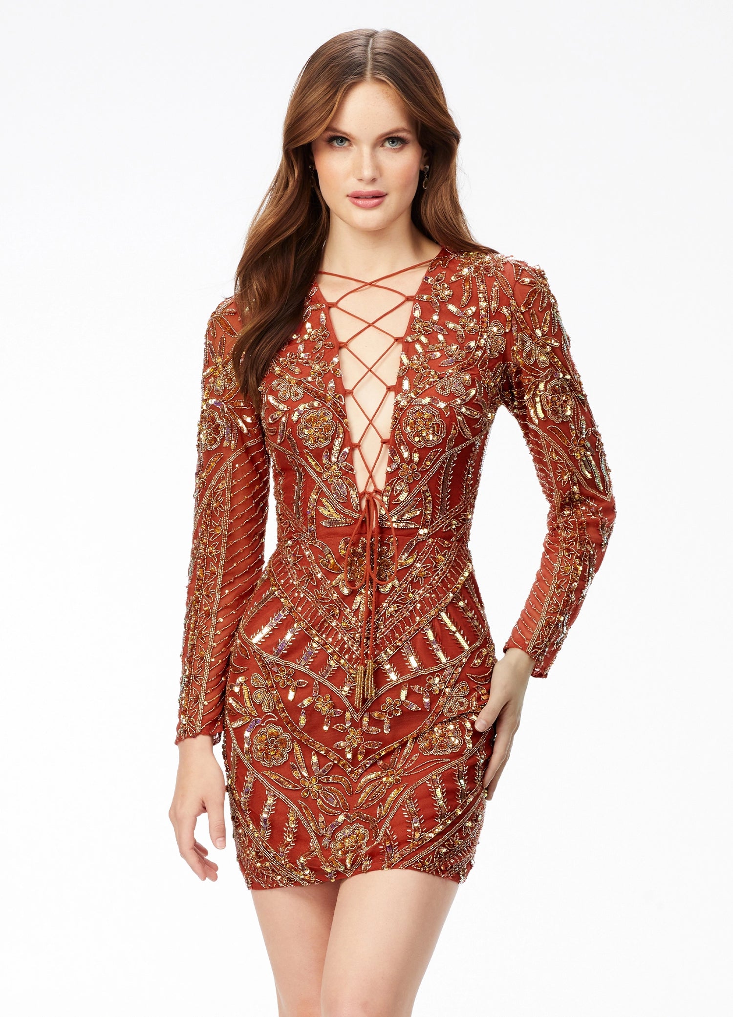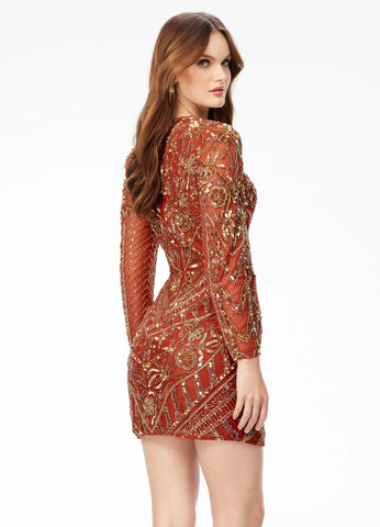 Turn heads in this show-stopping ASHLEYlauren 4511 cocktail dress. This dress features an elegant lace-up bustier with an intricate beaded pattern embellished onto a fitted skirt and long sleeves, designed to make you feel practically radiant. Are you ready to make a statement?
