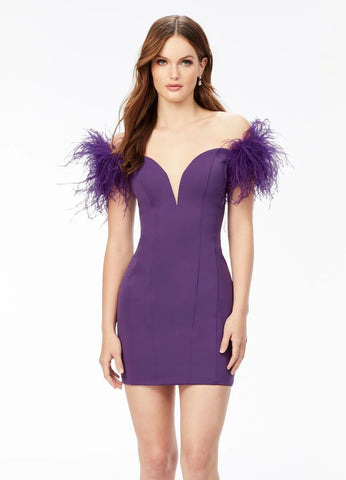 Make an unforgettable entrance in this ASHLEYlauren 4523 off-shoulder scuba cocktail dress. You'll look stunning with its feather details, sweetheart neckline, and signature contour seaming for a flattering silhouette. Dare to be flirtatious and feel beautiful!