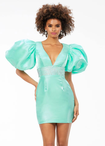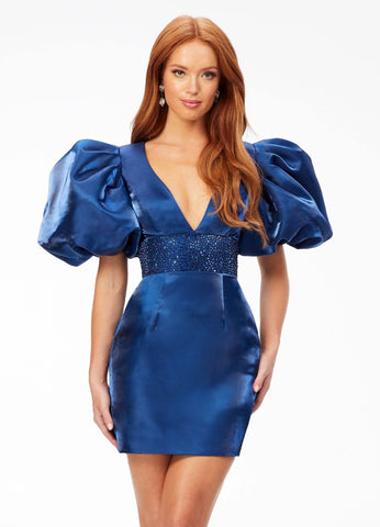We are so obsessed with this cocktail dress! This stunning v-neckline cocktail dress features oversized puff sleeves. The waistband is embellished with scattered heat set stones giving way to a fitted skirt. The look is complete with a center lace-up back.
