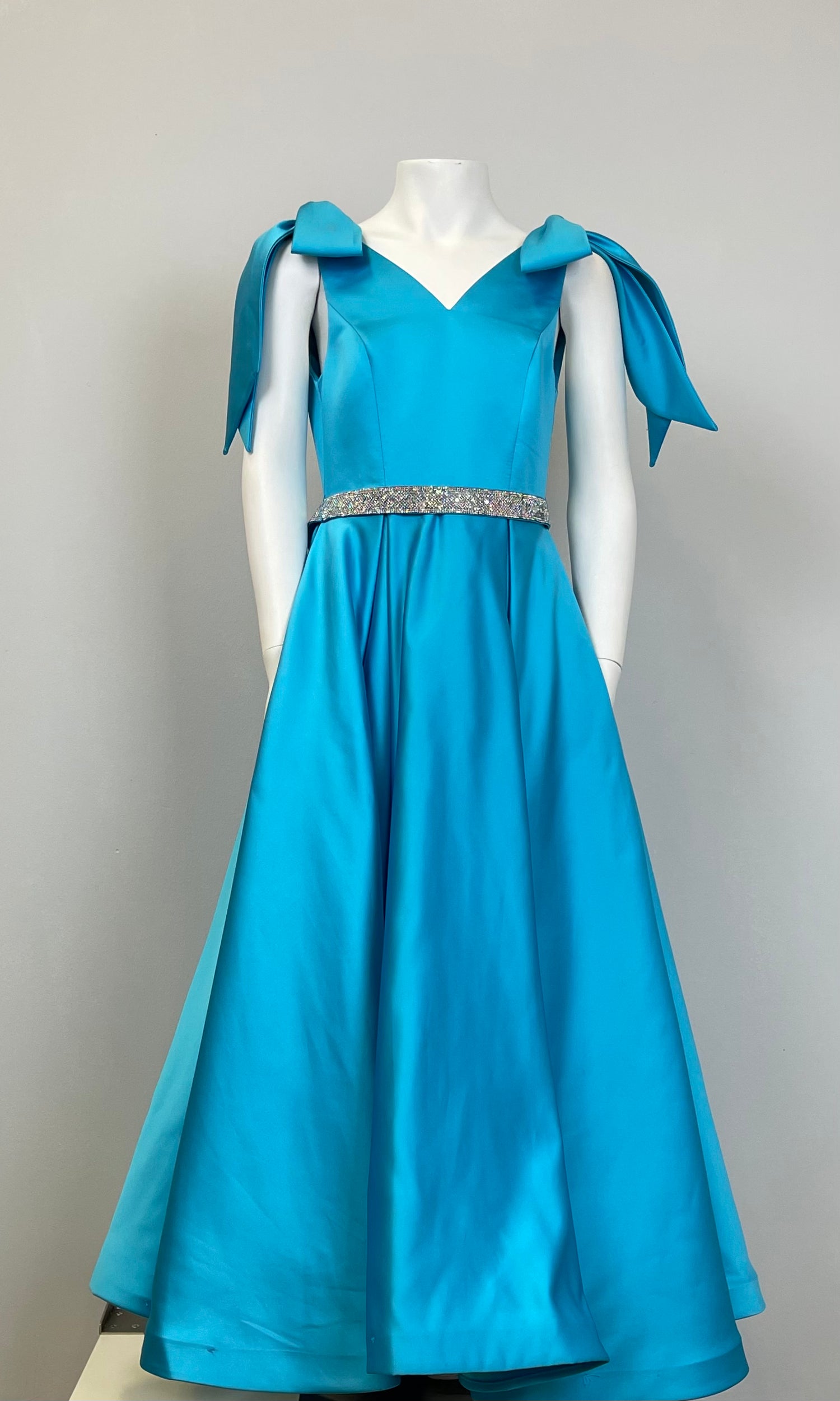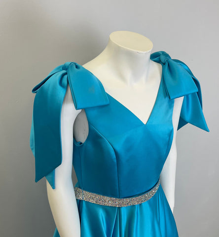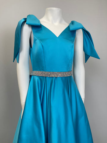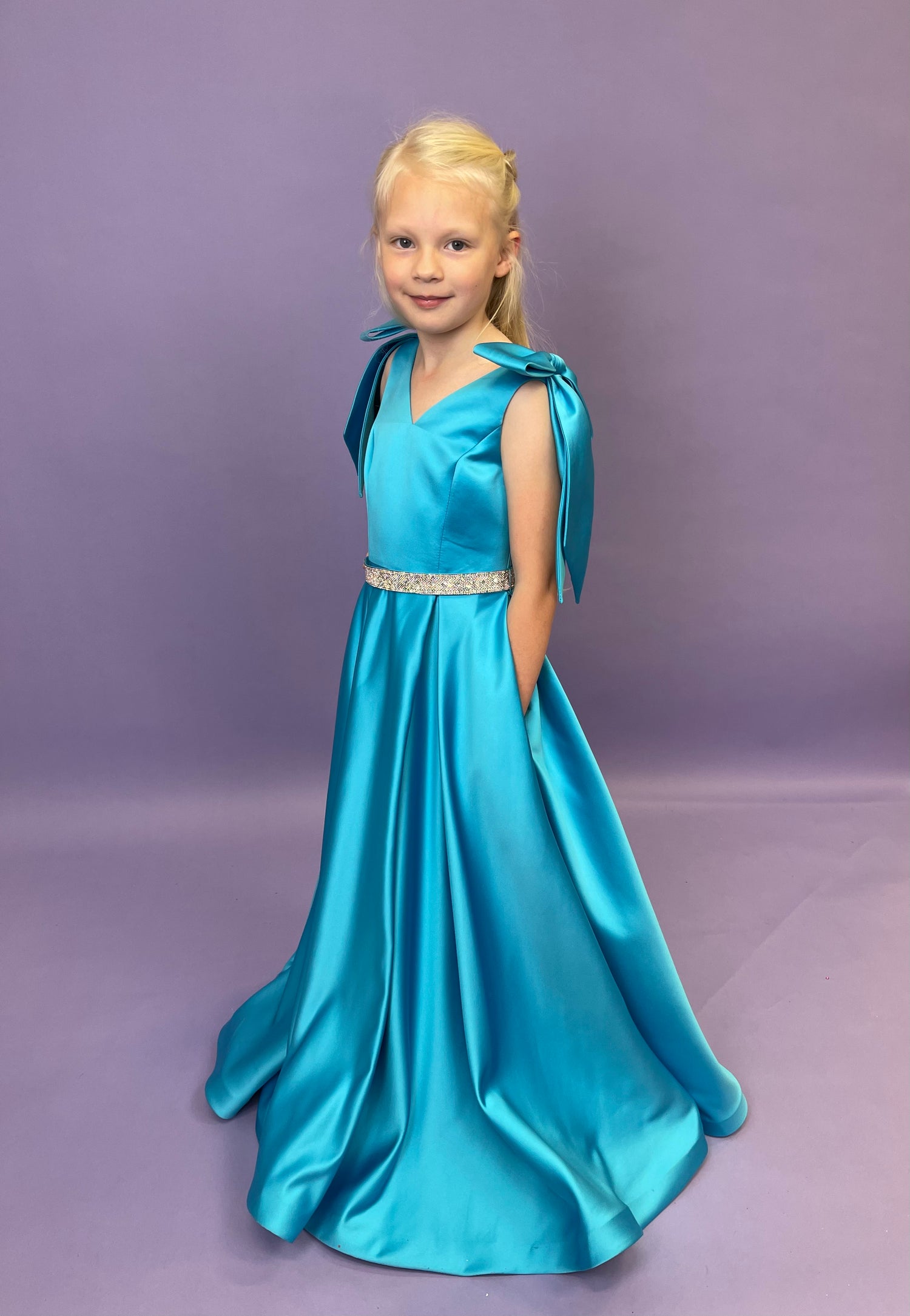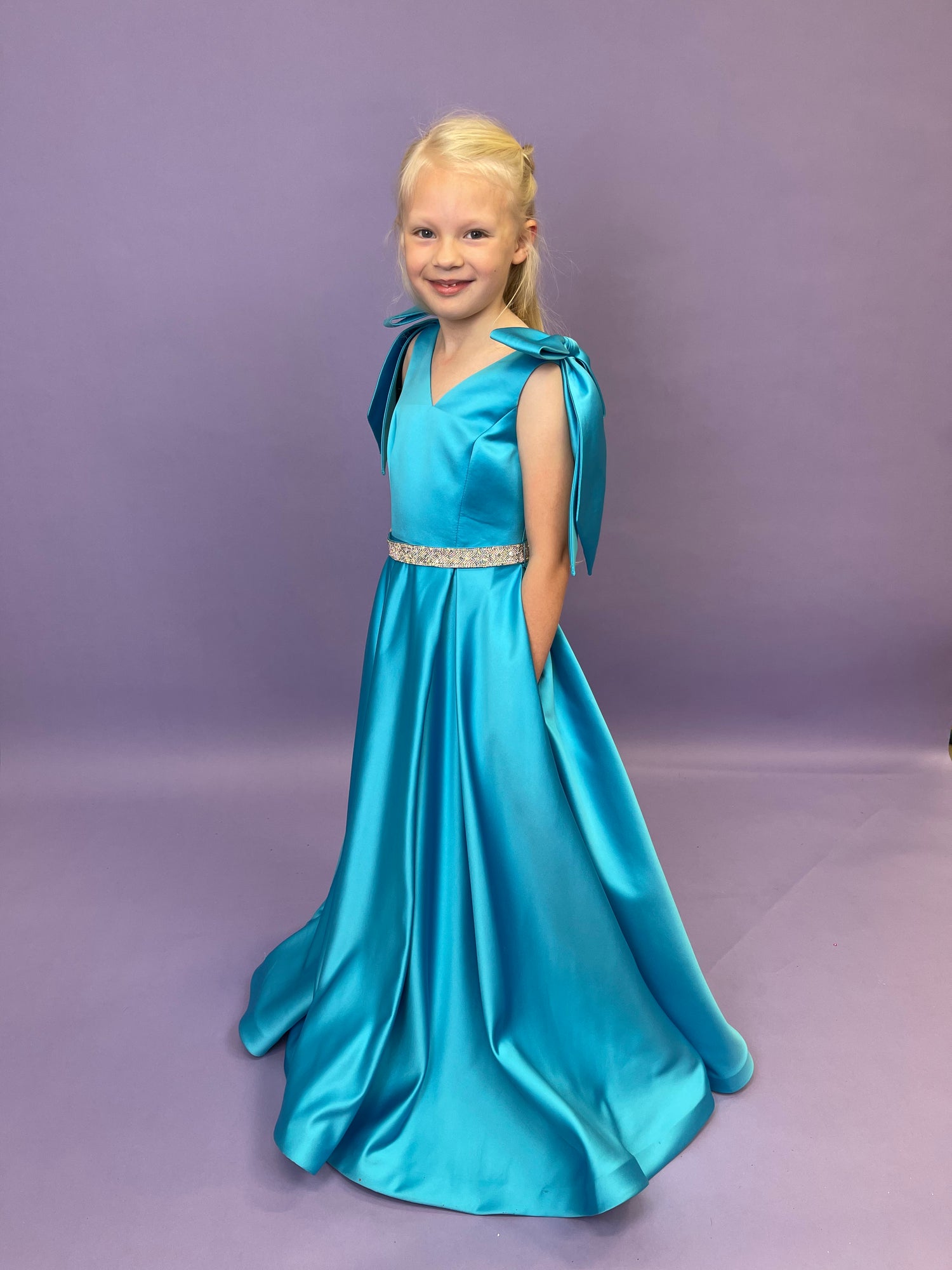 This ASHLEYlauren K80072 kids ball gown is sure to be a showstopper! With playful bows on the shoulders and a dazzling crystal belt, your little one will sparkle as they dance the night away. The comfy V-neckline completes the look, and they'll be the envy of all their friends!
