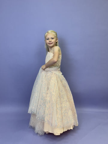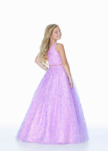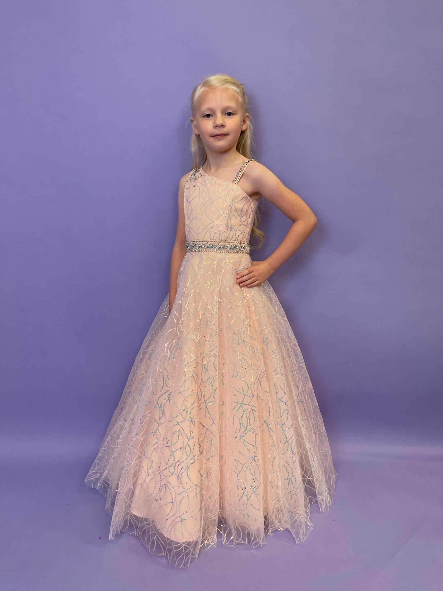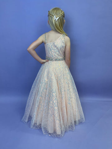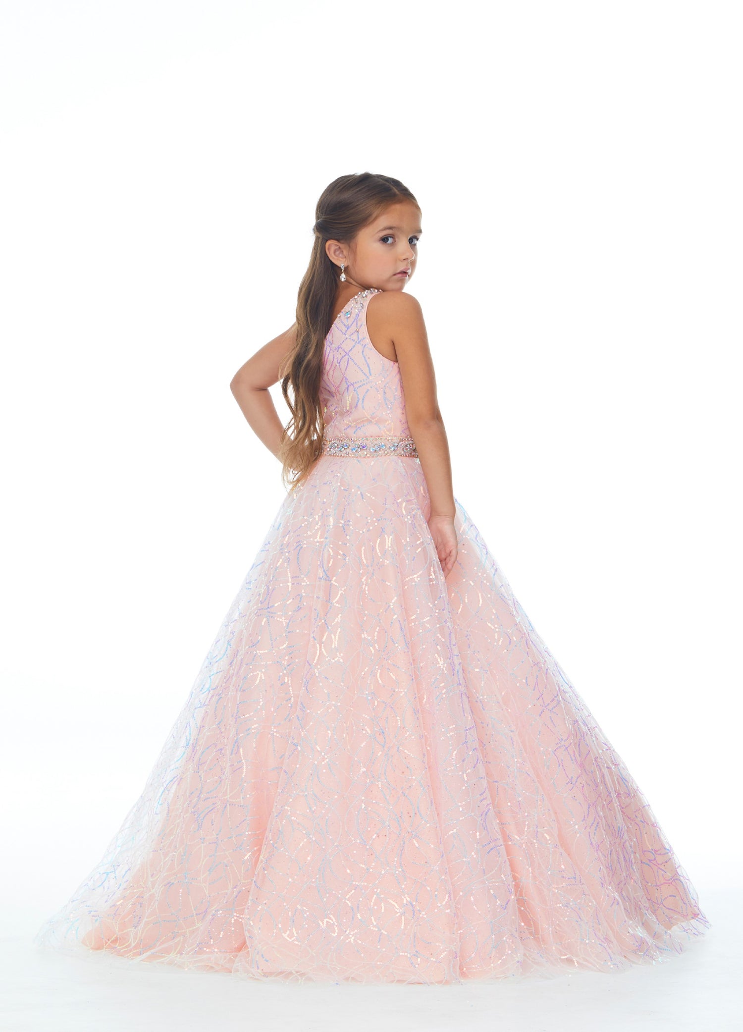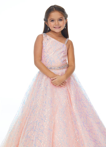 Turn heads and make a statement in this show-stopping ASHLEYlauren 8058 kids ball gown! Featuring a one shoulder asymmetrical design with a tulle skirt that sparkles on every turn, all topped off with a crystal belt - it's glamour at its best! Perfect for the young fashionista looking for a night to remember.