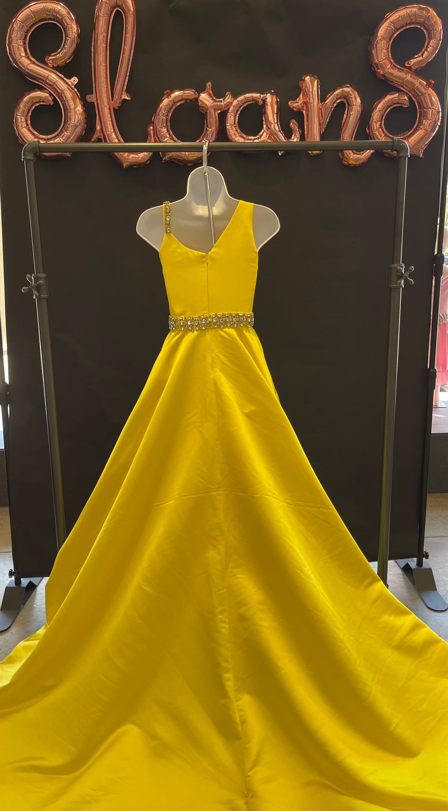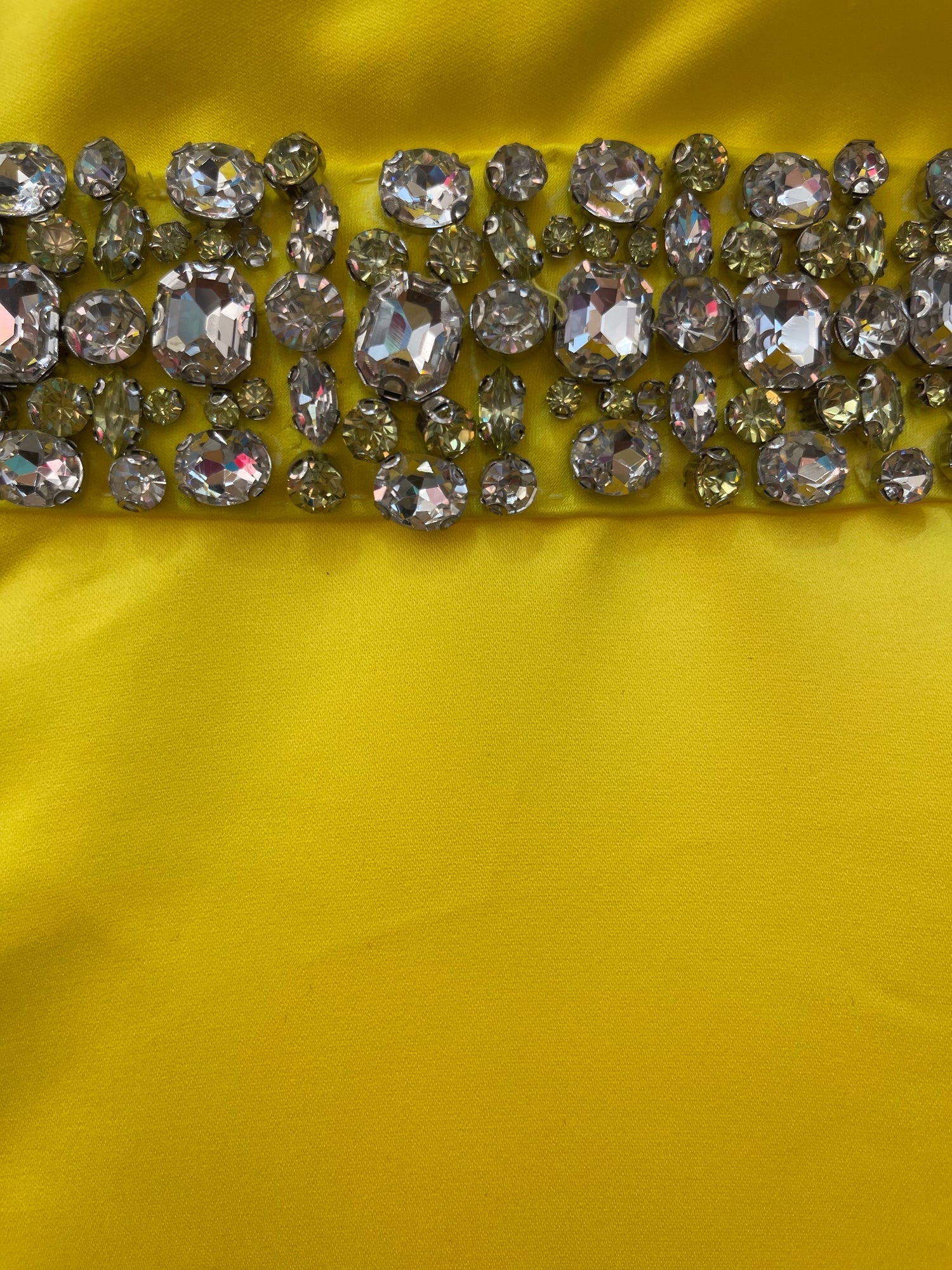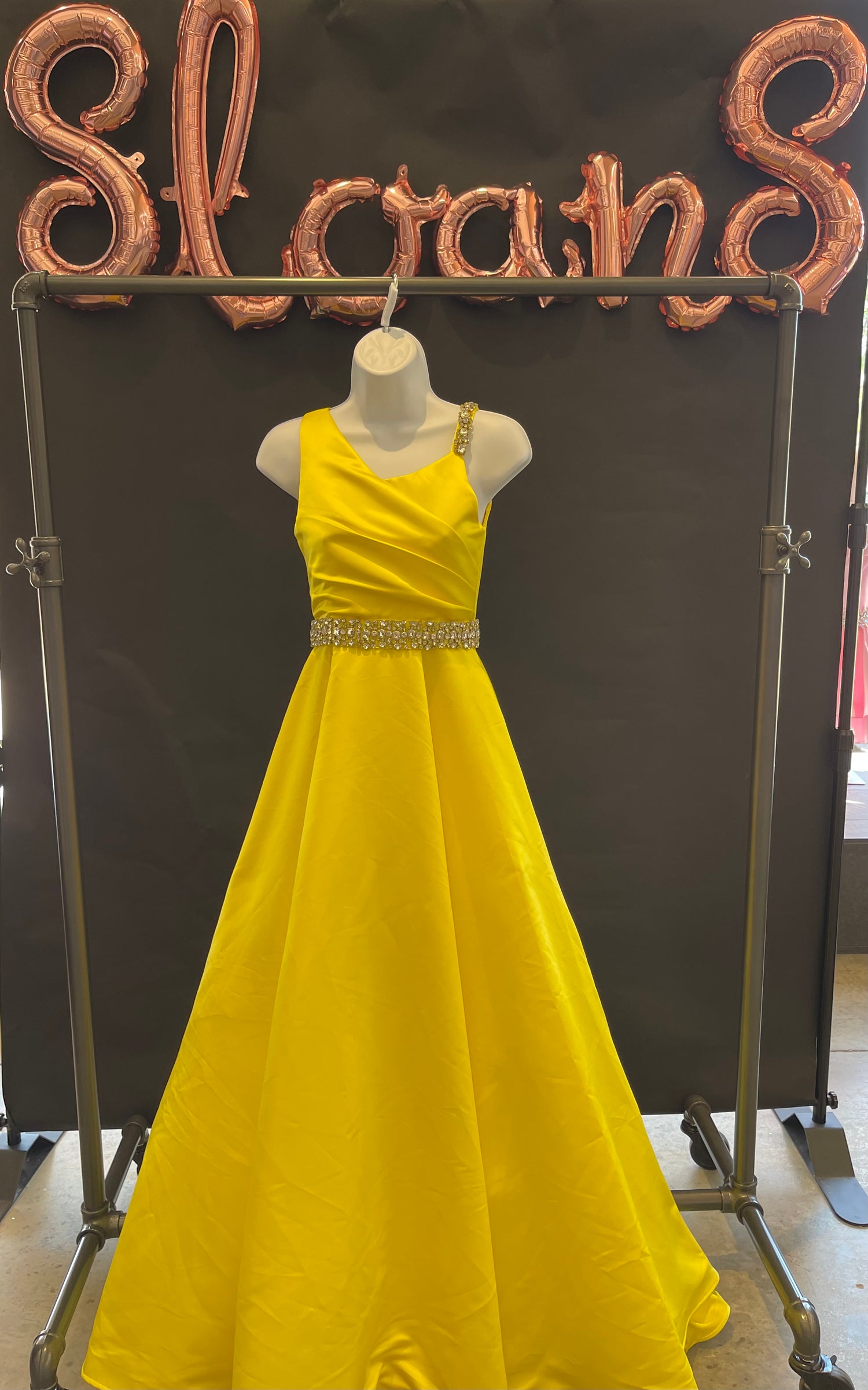 Bring the drama in this signature ASHLEYlauren heavy satin gown. The ruched bustier is accented by crystal encrusted shoulder straps. The same crystal details embellish the waistline.