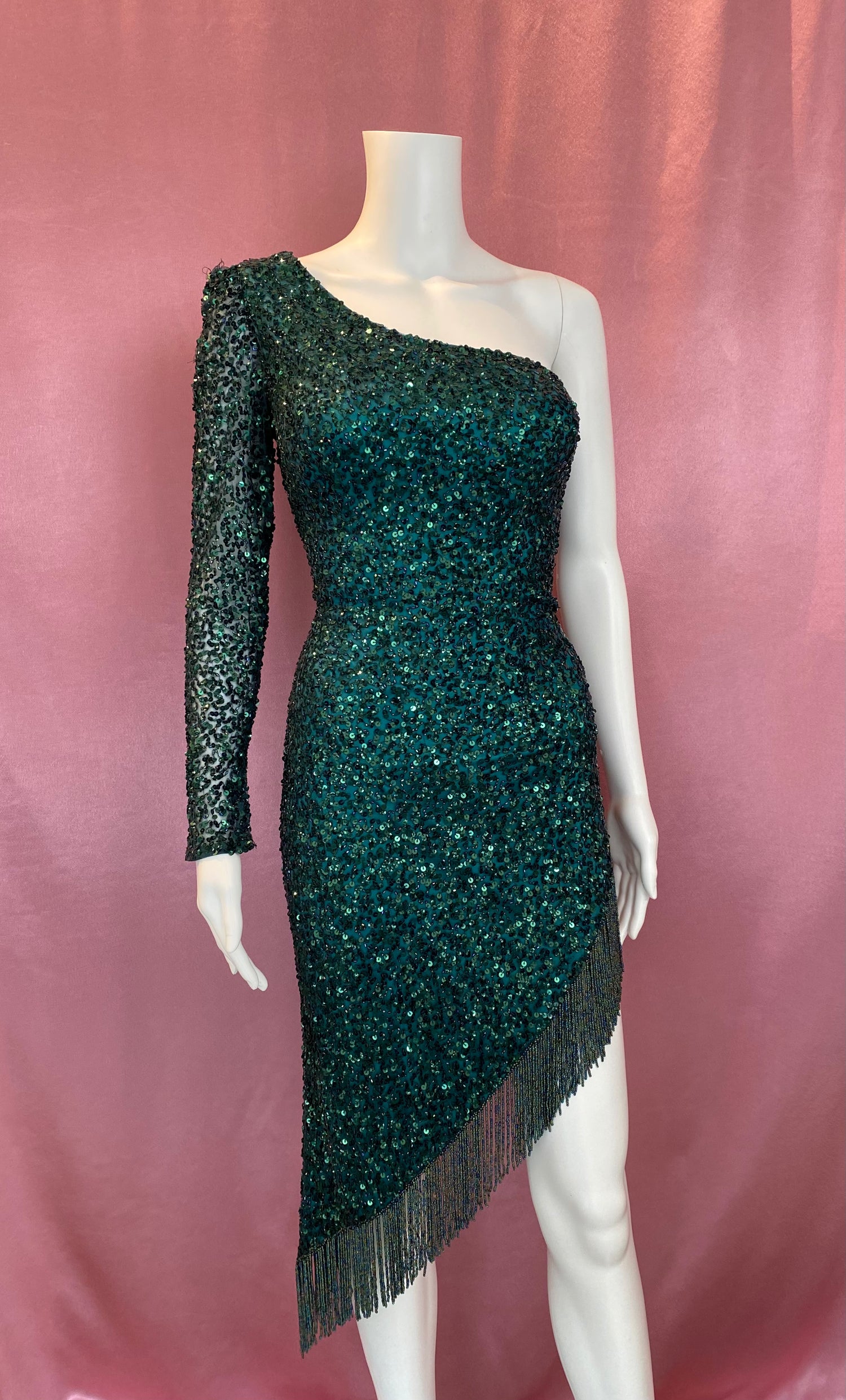 Make an unforgettable entrance in our ASHLEYlauren 4423 one-shoulder cocktail dress! This sequined stunner will have you dripping in sparkles as fringe detailing cascades like a waterfall from the hem. Show up & show out in style!