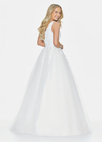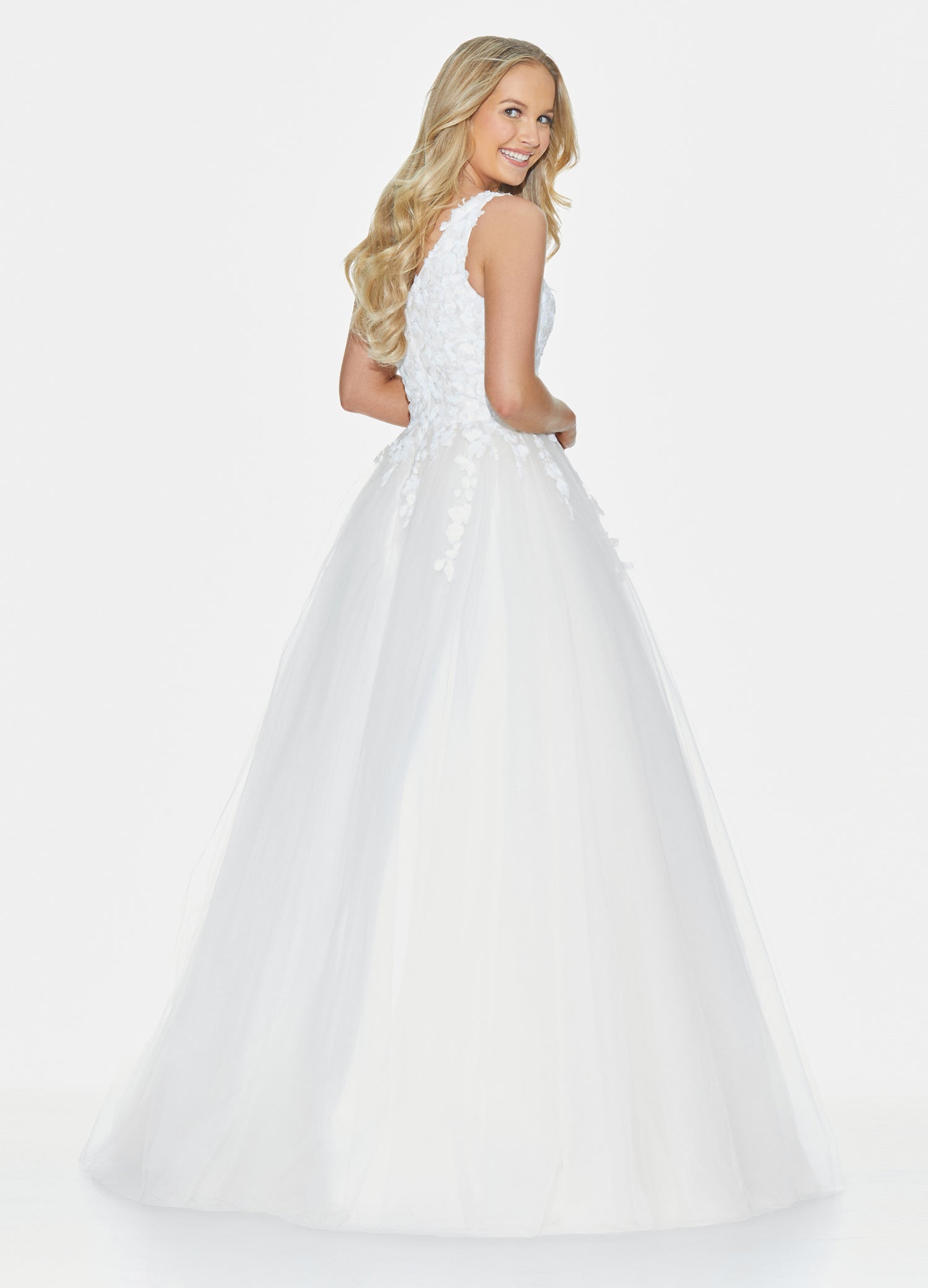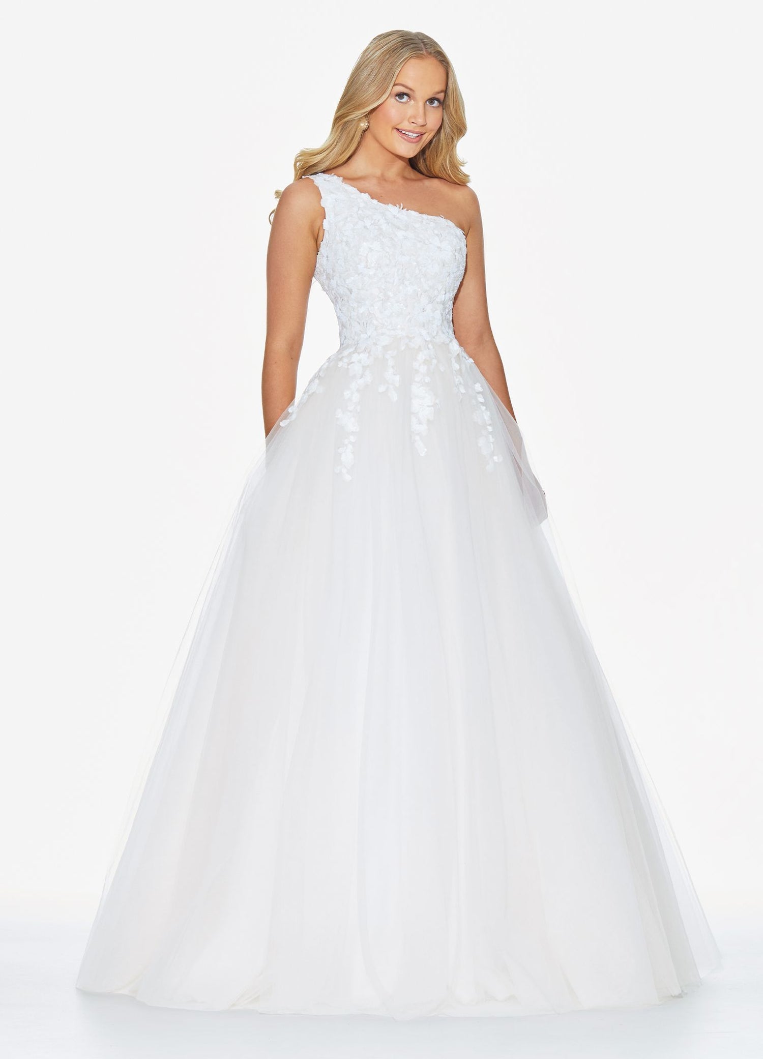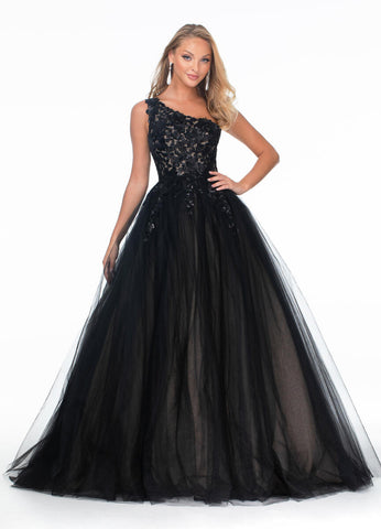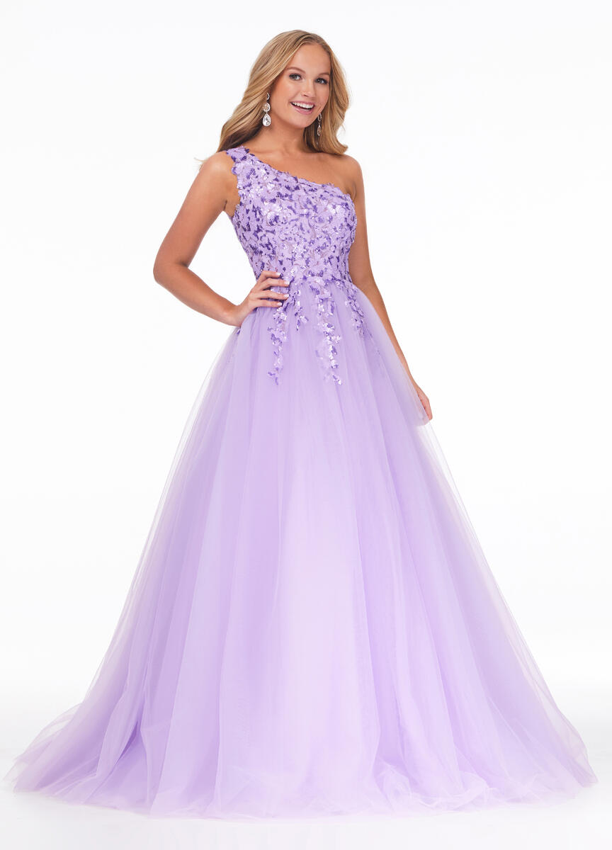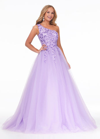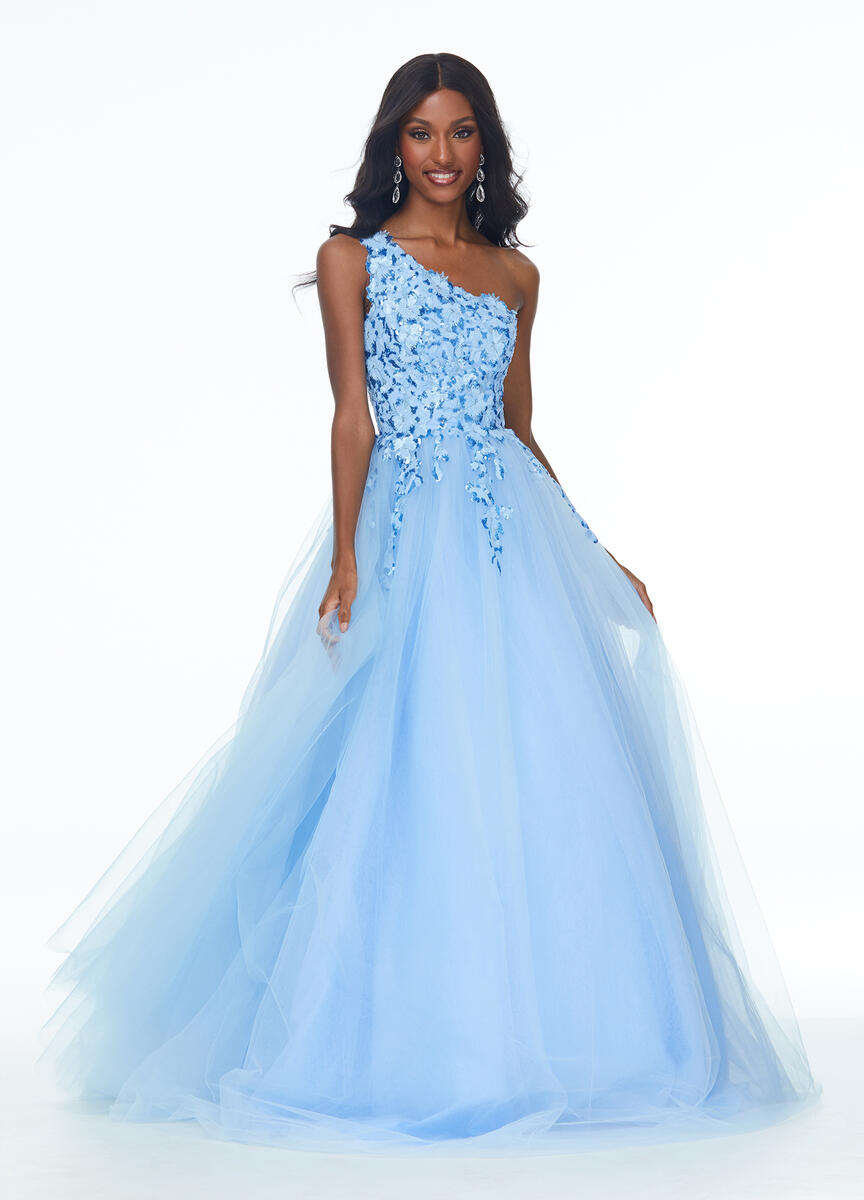 Show off your romantic side in this one shoulder tulle ball gown with sequin applique. The bustier is adorned with floral sequin applique that trickles down the A-Line skirt.