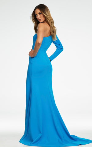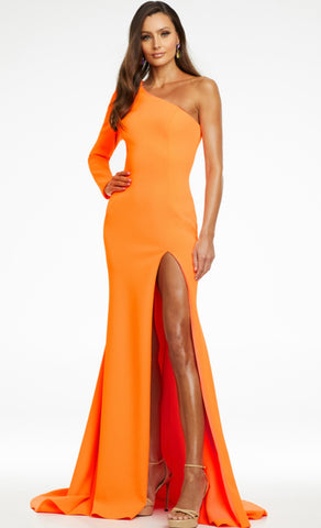 Show off your shapely figure in this AshleyLauren 11117 one sleeve formal gown. Featuring a classic silhouette with a stylish body-hugging fit, the thigh-high slit and train add a touch of drama. Flaunt your curves and wow the crowd.
