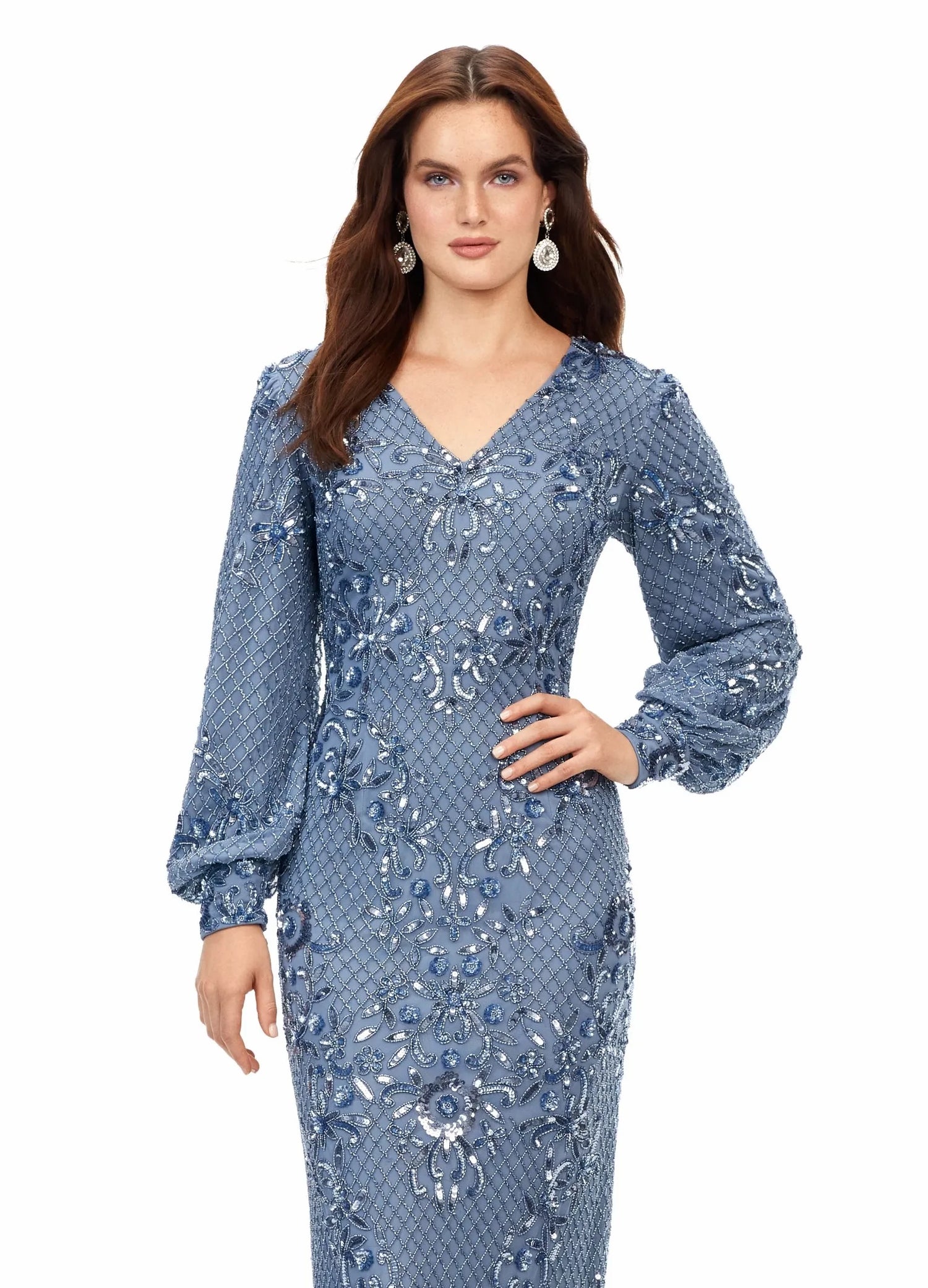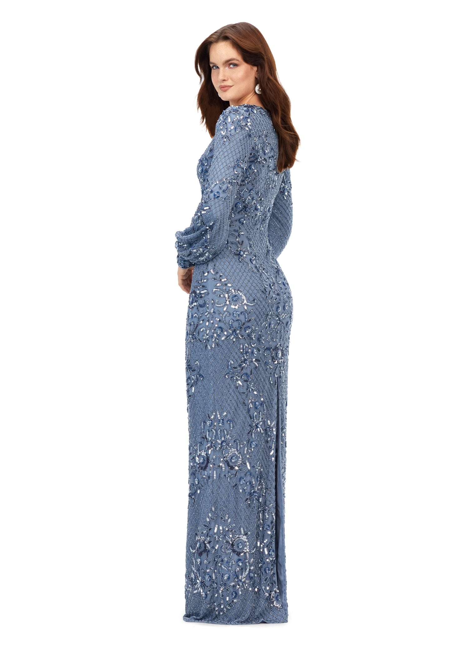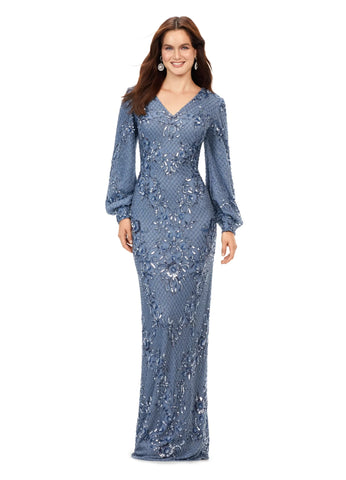 This ultra chic v-neck gown features an ornate bead pattern throughout, and carries onto the bishop sleeves. The full zipper high back, and center back vent completes the look.